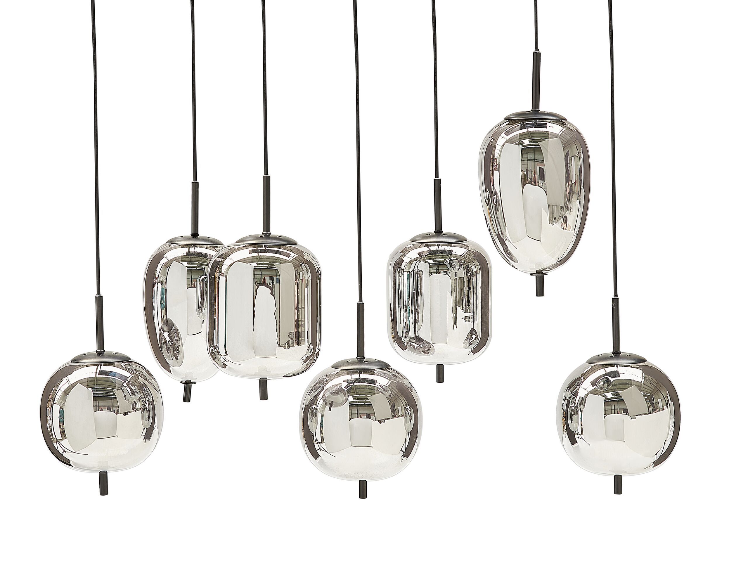 Hang this lamp in your dining room or living area to not only illuminate them with ambient light, but to also bring a modern vibe to the space. Crafted out of durable glass and iron, the lamp doesn't require daily maintenance to retain its unique and contemporary look. It features 7 light points, with semi-transparent, silver shades in various shapes, so it will definitely draw attention of all your houseguests. Details: Color: Silver, Black. Main material: Glass. Additional material: Metal. Weight: 9.5 Assembly: Requires Installation