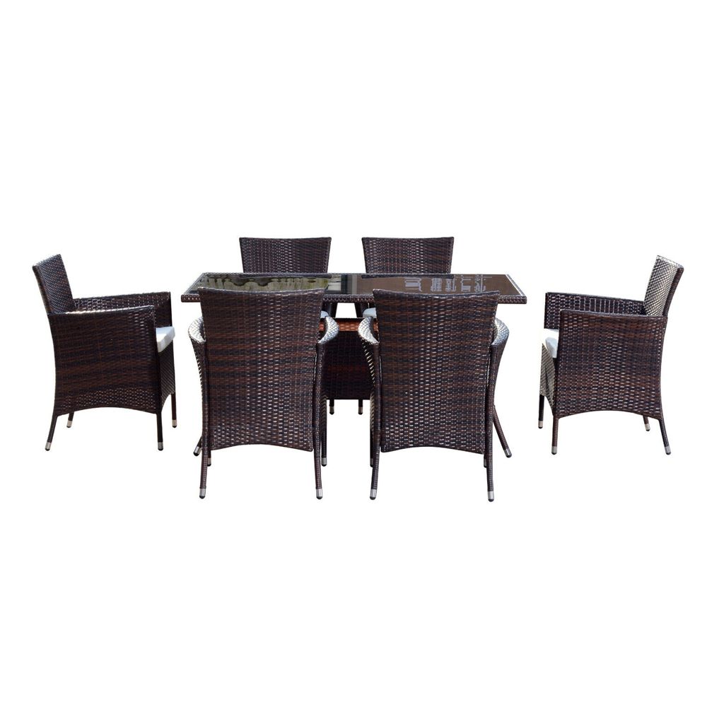 - 7 pieces of rattan garden furniture consists of 1 table and 6 chairs.