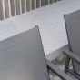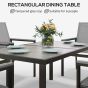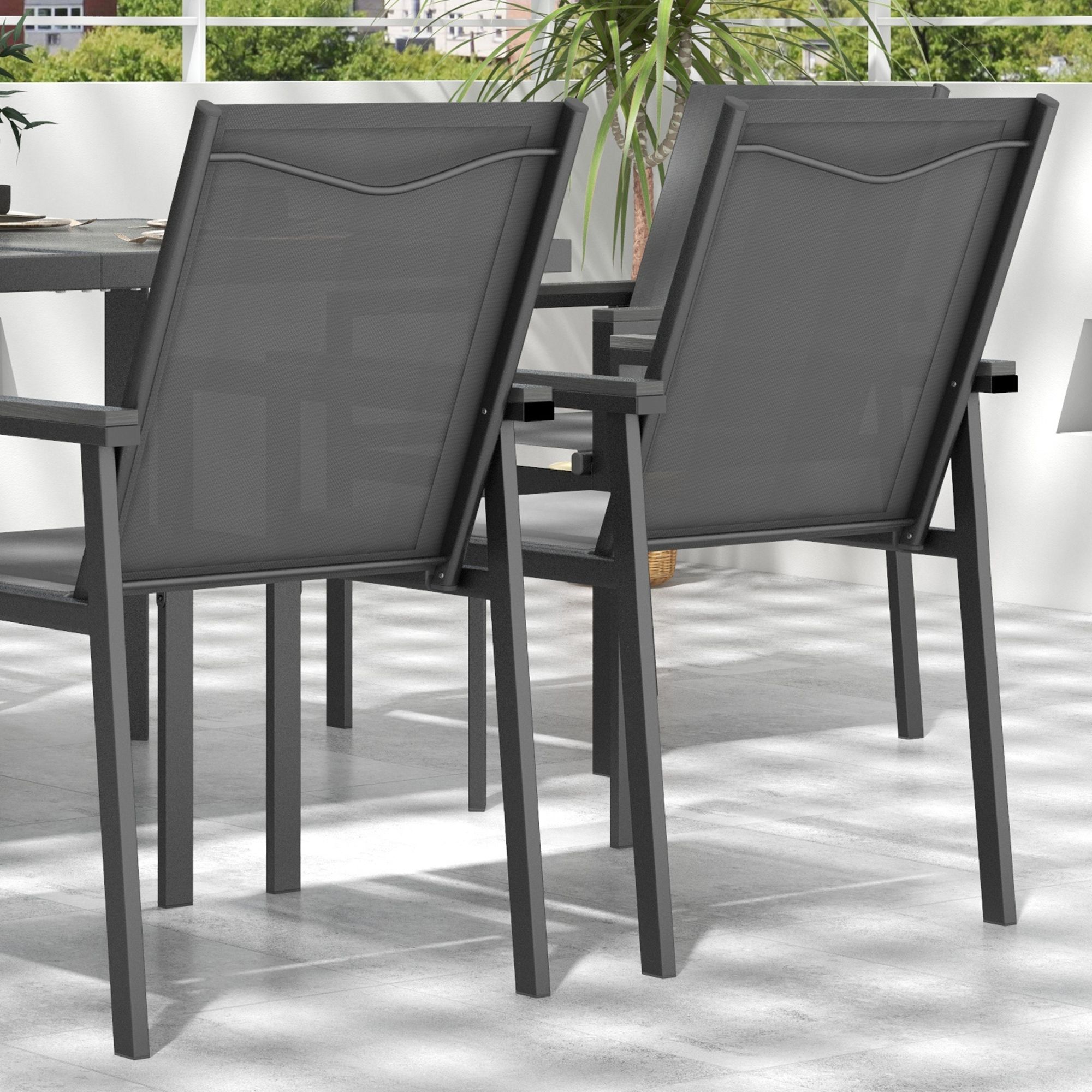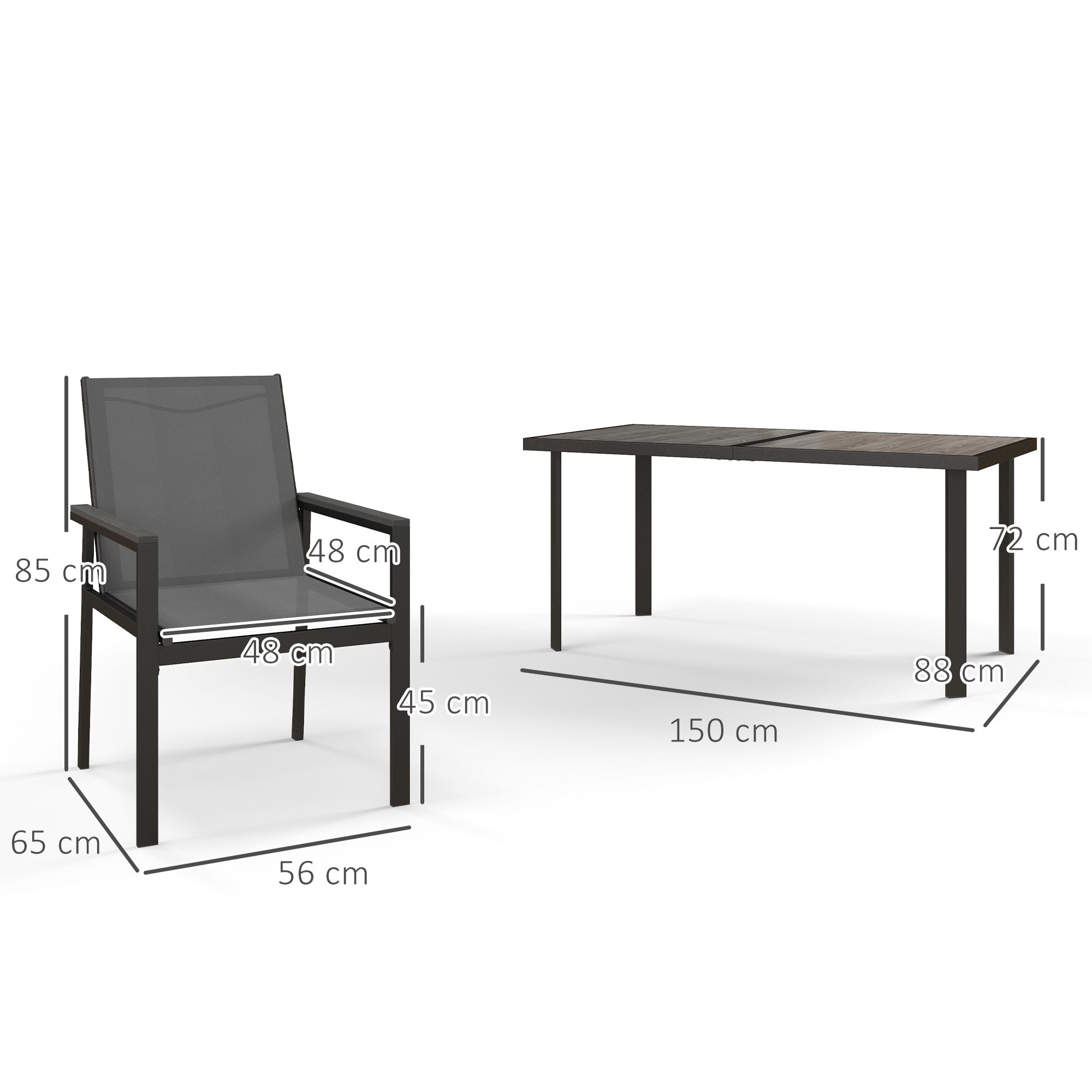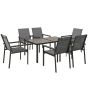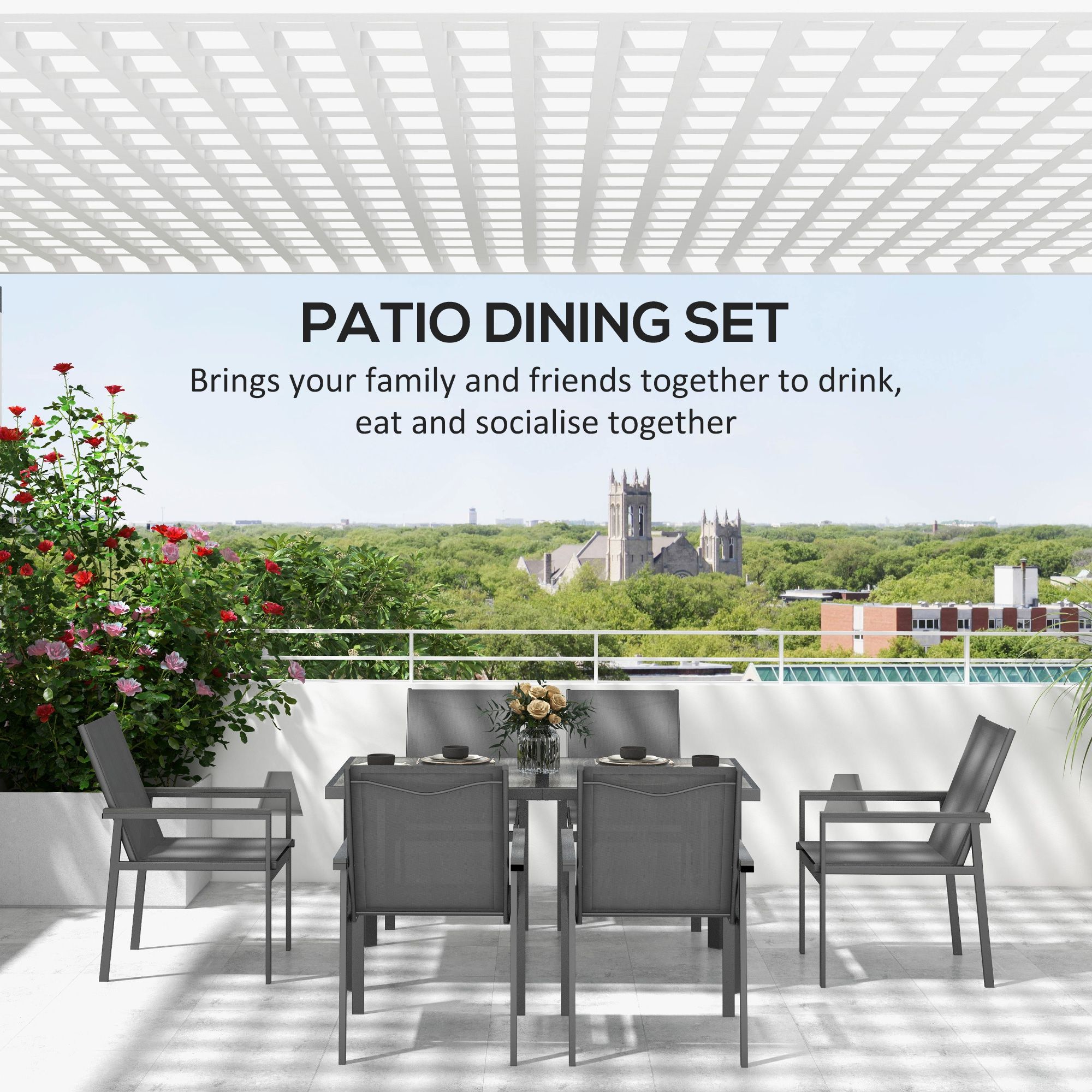 7 Pieces Garden Dining Set with Glass Top Dining Table, Outdoor Table and 6 Armchairs with Breathable Mesh Fabric Seats and Backrest, Wood-plastic Composite Armrests Top, Grey