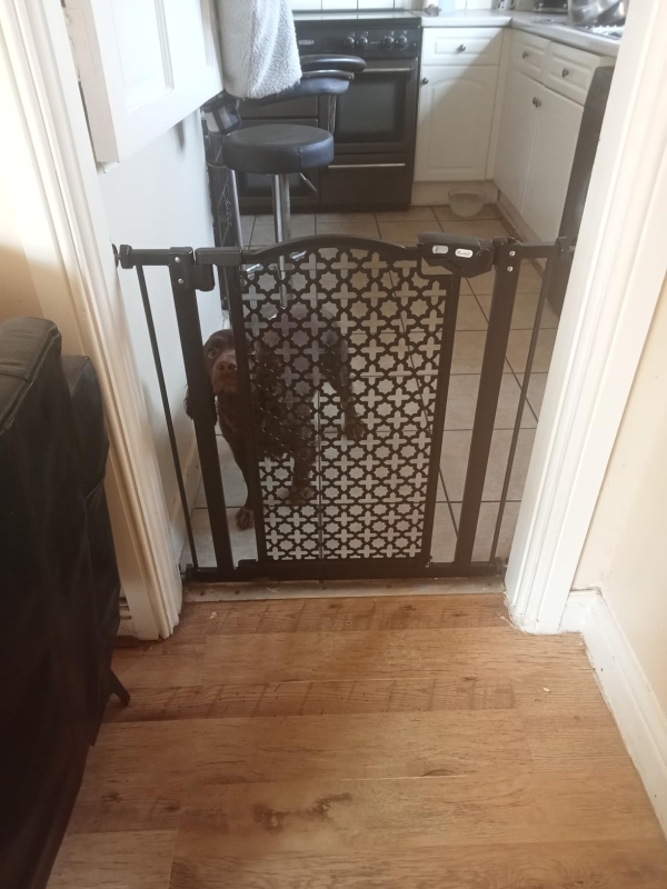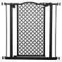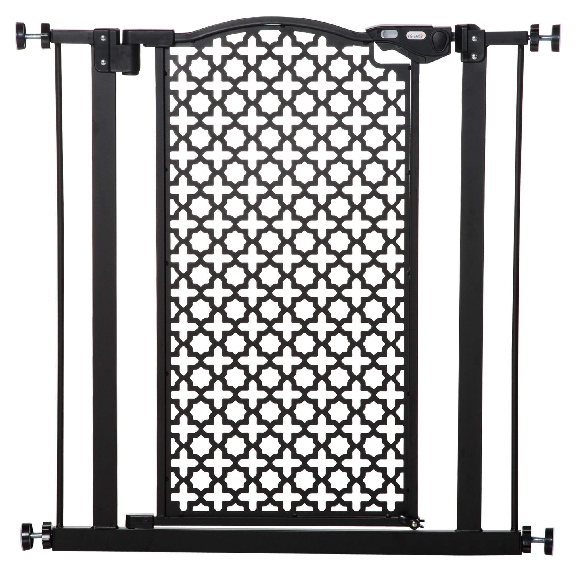 Keep pets away from specific places easily with this safety gate from. Designed with elegant carved pattern, which can decorate your room. It's made from solid steel for strength, and its width can be adjusted between 74cm and 80cm, allowing it to fit into different sized spaces with ease. Slide and lift, the handle is easy to open, allowing you to pass through quickly without your pet escaping for security. Double locking mechanism ensures your pet secured in a place to provide safety.