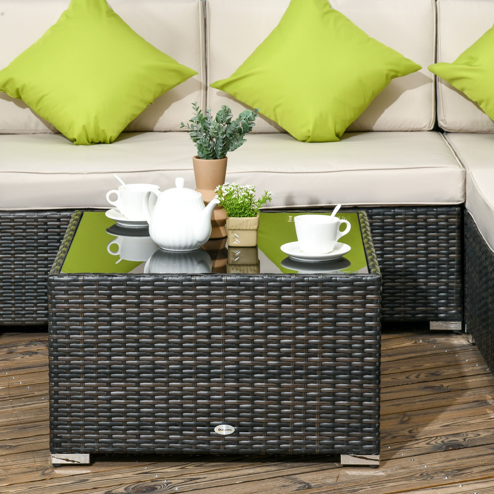 - Square glass top coffee table: A handy place to keep things near. Matches the rest of this rattan garden furniture set.