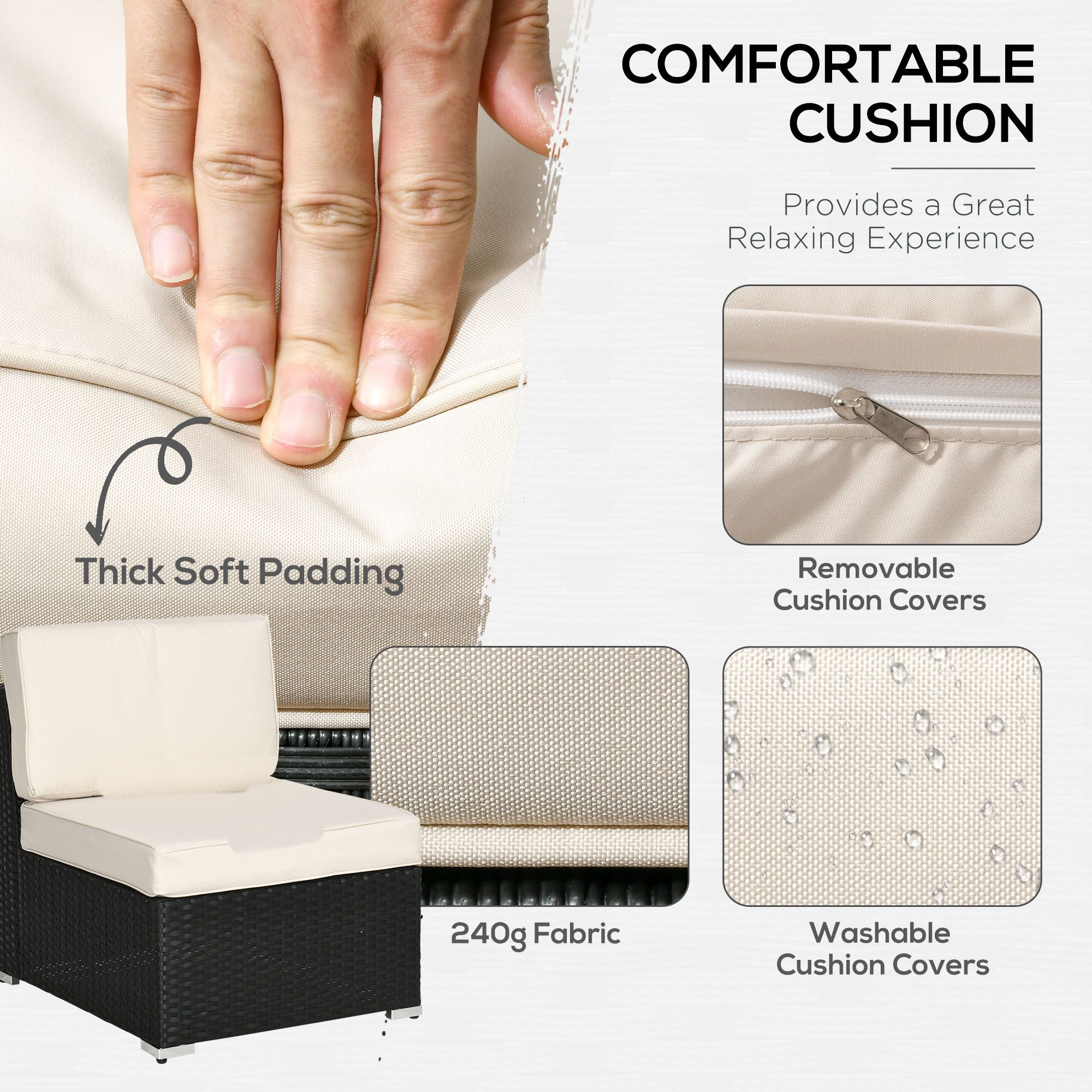 - Thick cushions: Relax in complete comfort as you relax on this corner garden furniture set. Four bright coloured throw cushions included.