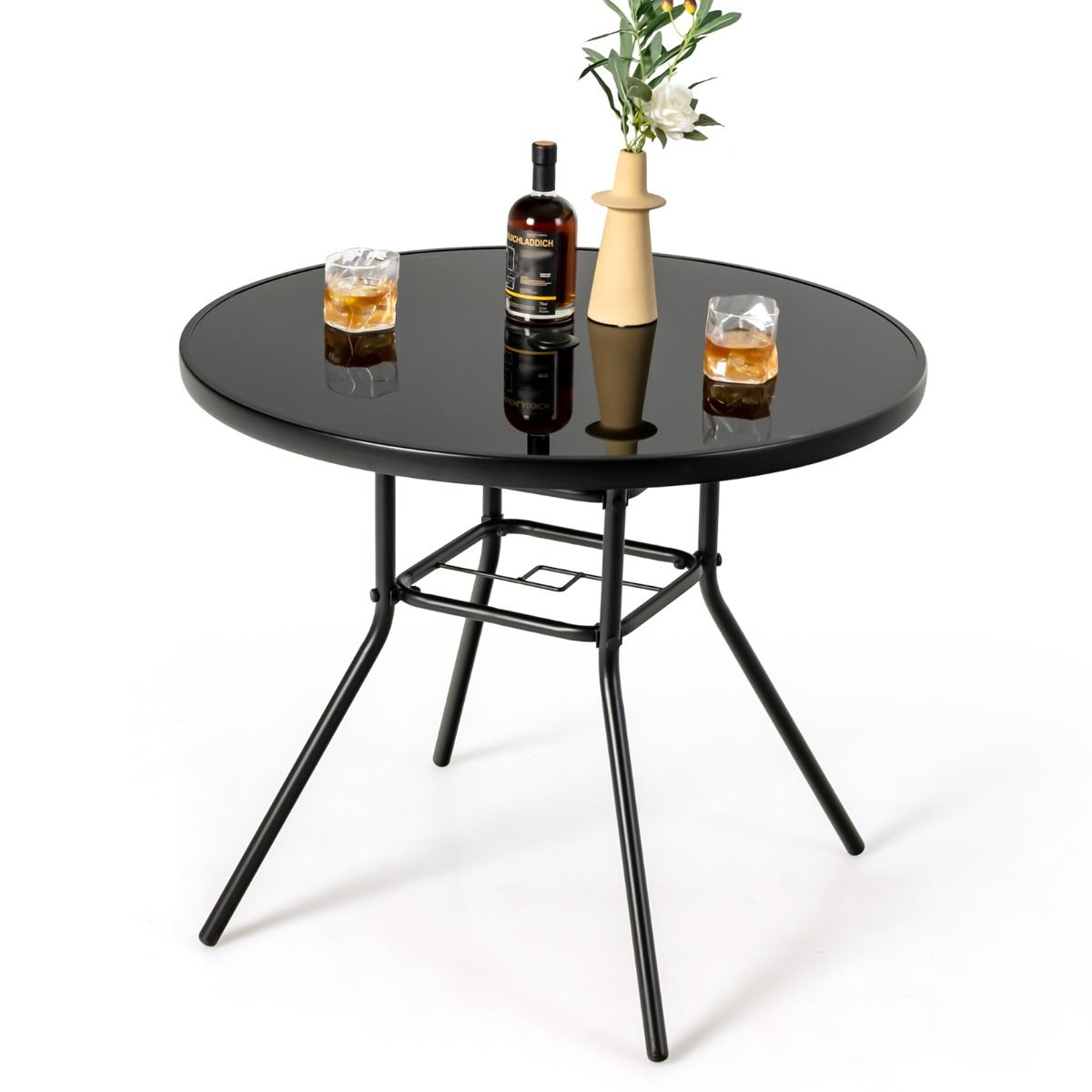 Equipped with an umbrella hole on the tabletop, the patio table allows you to relax in the sunshade. And the extra umbrella hole fixes the umbrella much more firmly. What’s more, the heavy-duty metal frame makes the table sturdy and durable. Made of tempered glass, the tabletop is quite simple to maintain and nice-looking. Plus, the round tabletop with 86 cm diameter is ideal for family or friend gathering. Whether in indoor or outdoor occasions, this patio dining table will satisfy your demands. 86 cm Spacious Tabletop: With 86 cm tabletop, the patio table is perfect for 4 people to sit around, which is ideal for family or friend gathering. Moreover, the tempered glass tabletop features weather resistance and high stability for long-time use. Useful Umbrella Hole: The umbrella hole in the middle allows you to add an umbrella for more comfort during relaxing. The 3.5 cm umbrella hole fits most patio umbrellas well. And the extra hole under the tabletop is designed for better fixation of umbrella. You can also cover the umbrella hole with the lid when not in use. Sturdy Metal Frame: The functional patio dining table is firmly supported by heavy-duty metal frame which is also rustproof and anti-deformation. Also, the anti-slip footpads not only protect the ground from scratches, but also improve the overall stability. Elegant Appearance: The whole table is in elegant black with modern style, which suits for both indoor and outdoor use. With this table, you can enjoy your meal time more pleasantly in different occasions. Easy Installation: The inert-in design of table legs makes installation much easier. And the clear instruction and complete accessories will help you finish the assembly with higher efficiency. Overall dimension: 86 x 71 cm (Dia x H).