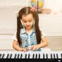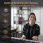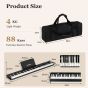 This digital piano keyboard is equipped with dual stereo speakers to play 128 tones, 128 rhythms, and 20 demos and 88 keyboard percussions. Besides, it can also upgrade your songs with sustain, vibrato, transposition, metronome and 2 chord. 88 full-size semi-weighted keys can not only give you a real touch of piano, but also deliver adjustable intensity response to your touch. In addition, wood grain design further enhances the playing comfort. Split function allows for duet playing and 2 teaching modes with lighted key function help you to learn to play with fun. To offer you more convenience, we also design it with one-button buckle design for folding and portable bag for carrying. Moreover, 1750mAh built-in battery can last up to 12 hours playing time after a full charge, bringing much more convenience to your travel. Many external jacks and dual wireless connections function enable it to work with apps, MP3 and other devices. If you are looking for a digital piano keyboard like this, do not hesitate to place an order! Multifunctional Piano Keyboard: This electric keyboard with 2 stereo speakers can display a sound of 128 tones, 128 rhythms, 20 demos and 88 keyboard percussions. Besides, it's designed with functions of sustain, vibrato, transposition, metronome, single-fingered and fingered chord and record and play. Split Function and 2 Teaching Modes: Our digital keyboard features split function for duet playing. After turning on "Split" function, left 44 keys change from A1-B4 to A2-B5, while the right change from C5-C9 to C3-C7. And there are 2 teaching modes for learning. You can long press the metronome button to turn on or off the keyboard light, making the teaching process more interesting. Foldable and Portable Design for Carrying: Different from ordinary piano keyboard, our piano keyboard can be folded out in half to save space. A safety button and a security clip are designed to ensure double insurance. And it comes with a portable bag for easy carrying and storage, allowing you to enjoy music wherever you go and store it in any corner. Full Size Semi-Weighted Keys with Wood Grain: 88 full-size keys give you real touch of piano for infectious playing time. The upgraded wood grain design maximizes the playing comfort. Apart from that, thanks to the semi-weighted keys, you can freely make the sound effect lighter or louder by changing your knocking intensity. Easy Charging and Dual Wireless Connection: Our electric keyboard with 1750mAh built-in battery can be charged by 5V 1A power adaptor. Additionally, with 5 external ports (include USB/MIDI interface), the keyboard can be connected with MP3, microphone, headphone and speaker. Wireless audio connection makes the keyboard be an audio equipment while the wireless APP connection gives you step-by-step guidance.