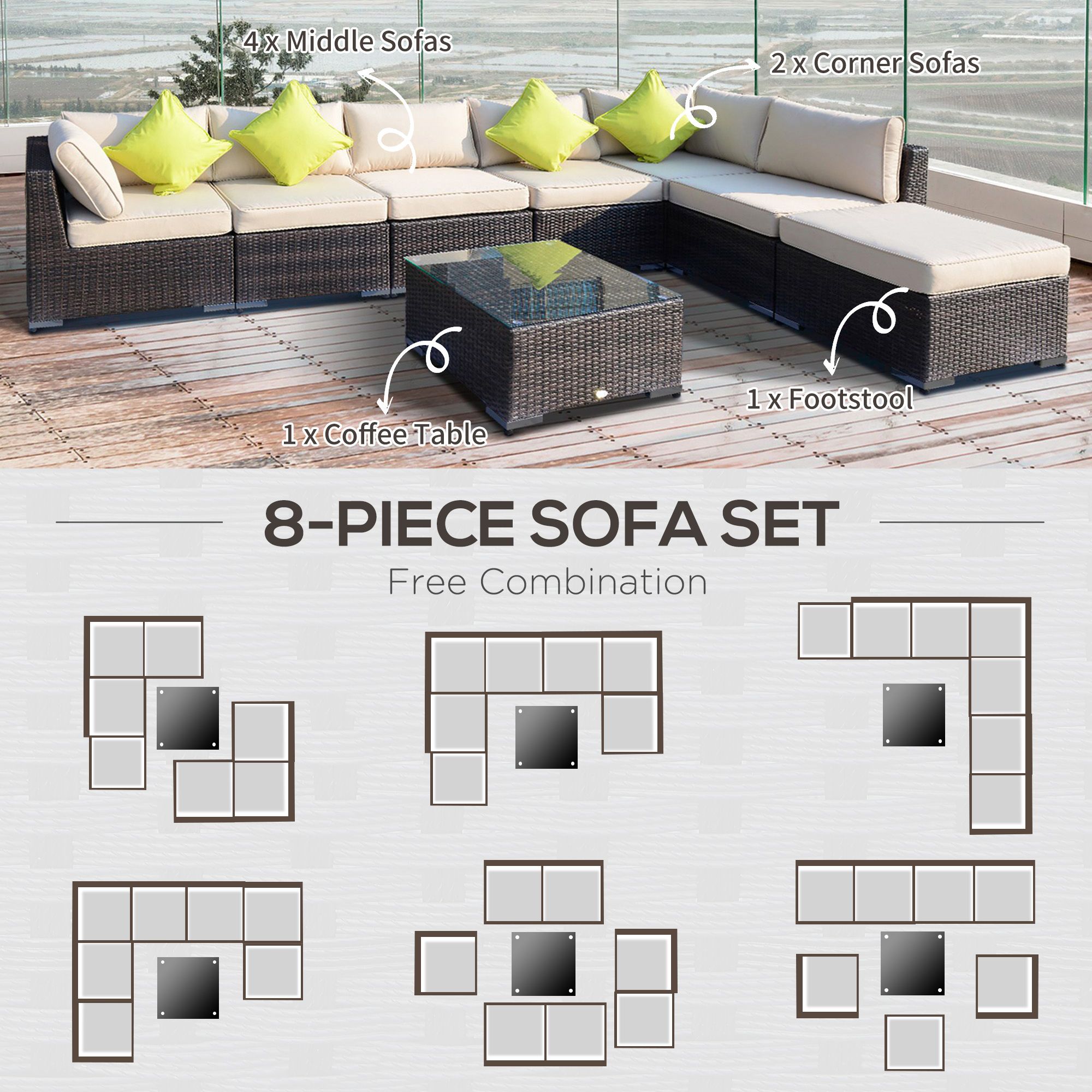 - STYLISH EIGHT-PIECE SET: The rattan corner sofa is formed of two corner seats, four middle seats, a footstool and a coffee table, giving you complete freedom to set it up how you like. The rattan garden furniture is perfect for relaxing with friends and family.