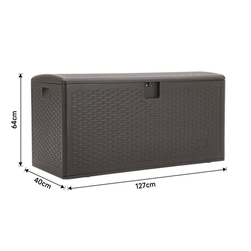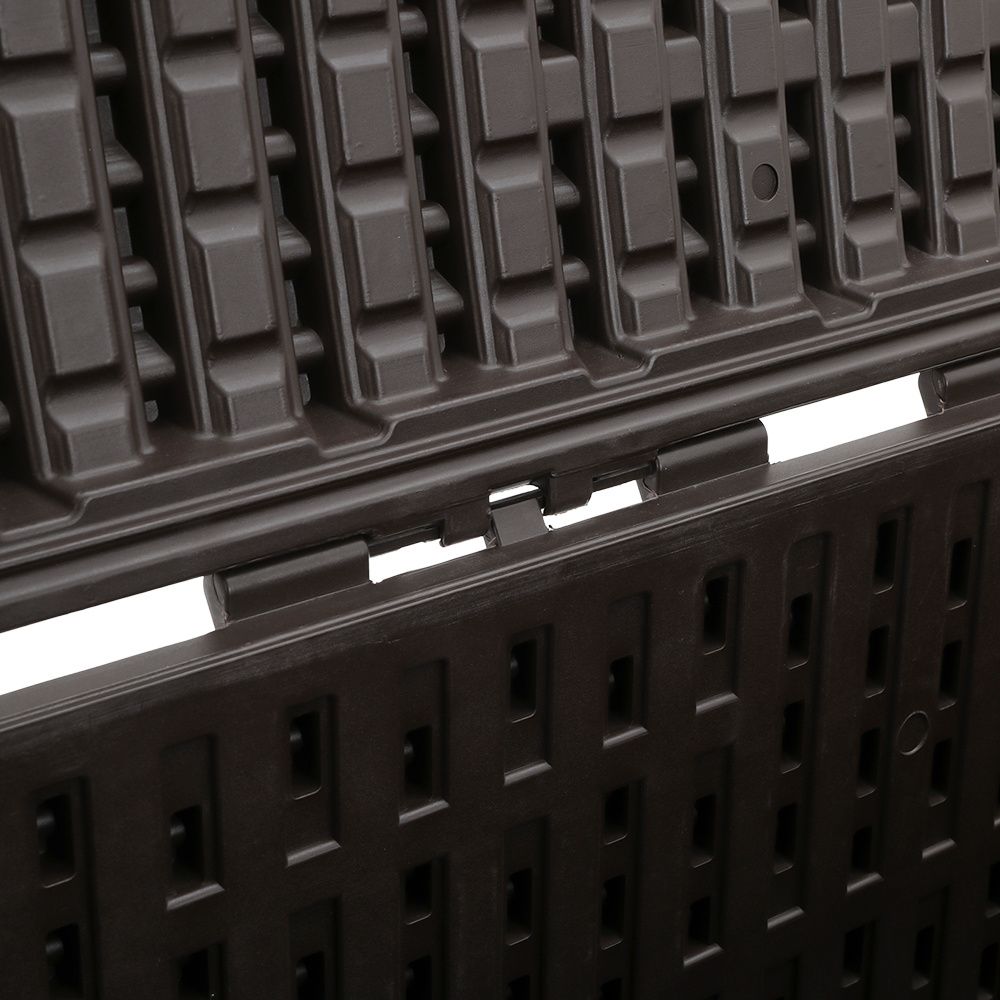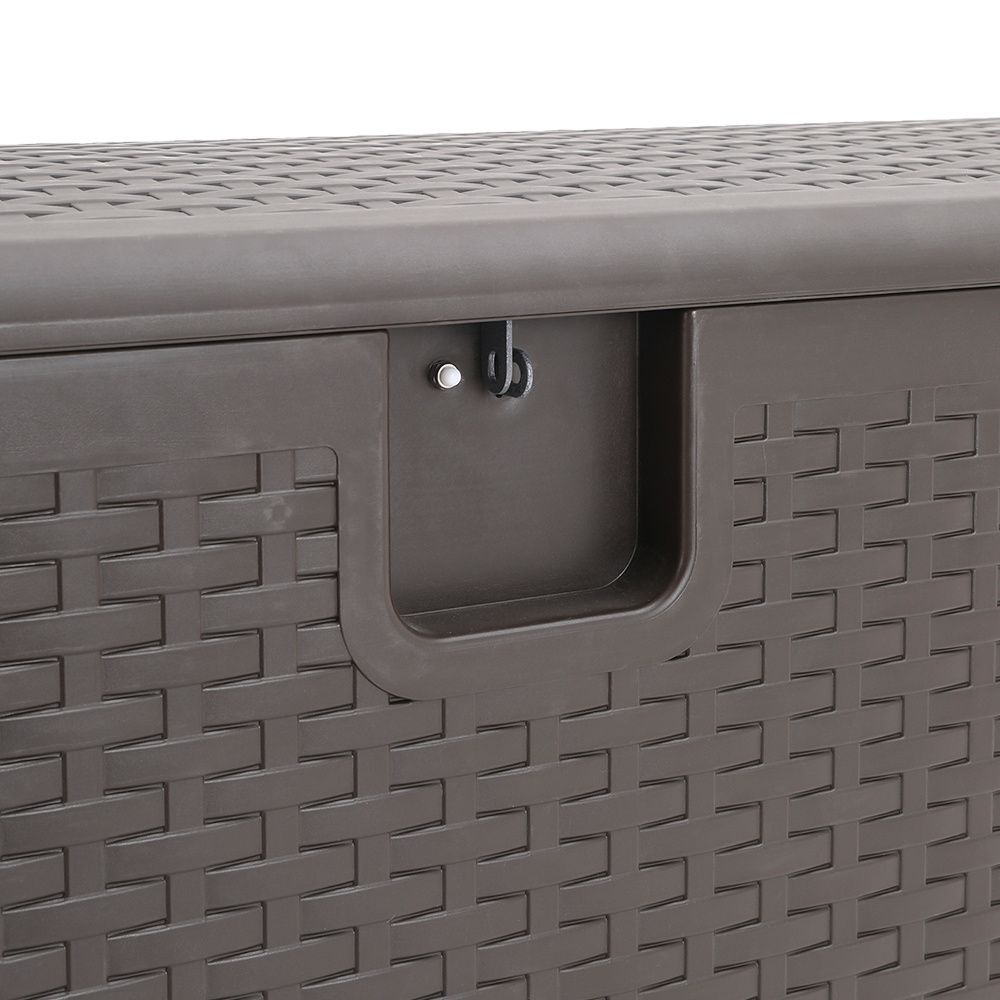 The Deck Box makes organizing your pool equipment or outdoor items around your patio easier than ever. The surface features a rattan texture for a chic appearance, yet it is completely waterproof, ensuring that the items remain dry and clean when stored inside. Crafted from HDPE material, it features a strong plastic construction that blocks moisture and can withstand outdoor exposure to snow and rain. The hinged top allows for easy access, and the box is lockable (lock not included) for added security.