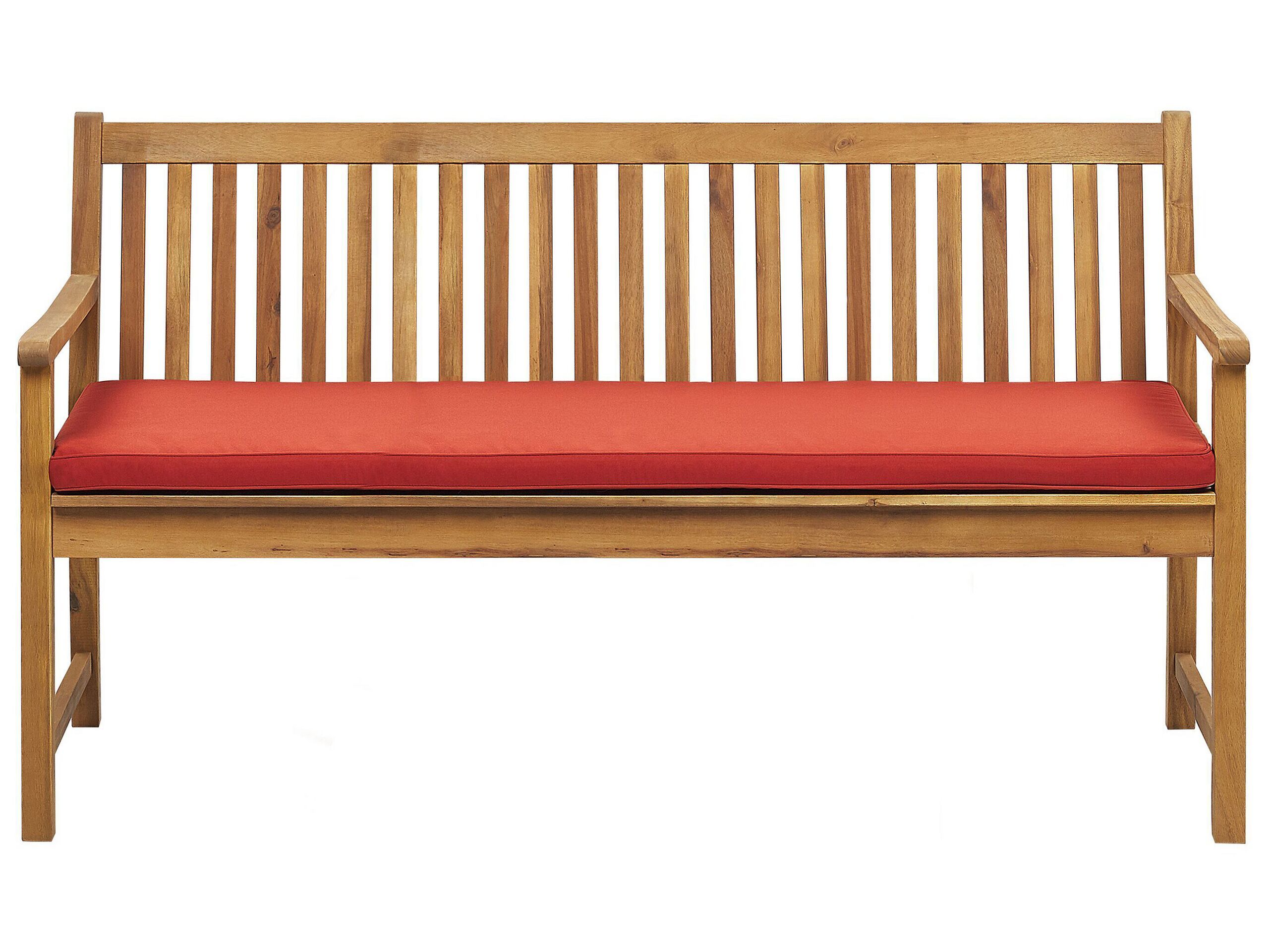Enhance your outdoor surroundings with this capacious wooden bench, made from durable acacia wood. Its classic, rustic-inspired style makes it a perfect addition to any outdoor area. Accommodating up to three people, this bench is the perfect companion for hours of rest and relaxation in your garden, patio or terrace. The included seat pad contributes to the additional seating comfort. Details: Color: Light Wood, Red. Main material: FSC® Certified Acacia Wood. Additional material: Polyester. Material Composition: 100% Polyester Weight: 20 Capacity: 3 People Assembly: Full Assembly Required Wood type: Acacia mangium Wood Origin: Vietnam Weight Capacity: 480 Cushions Dimensions: 152x54x5 Legs Height: 39 Padding Thickness: 5 Seat Height: 45