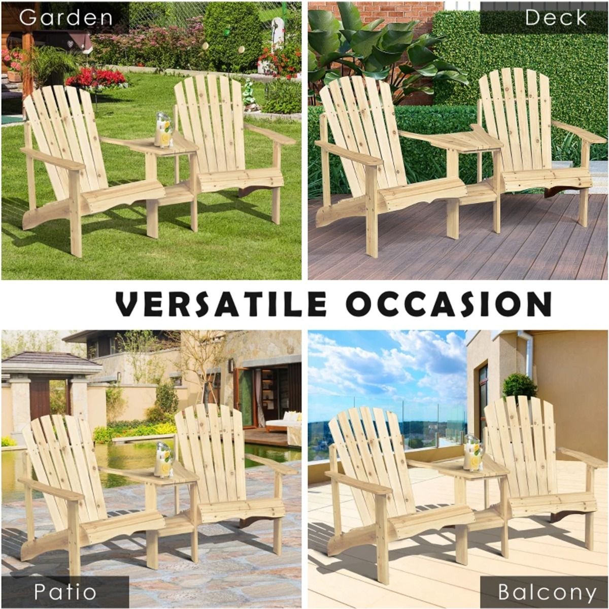 A classic garden furniture piece, with a modern twist: invite this two-in-one Adirondack chair to refresh your garden this season. Made from fir wood, it's crafted into a connected two-seat design, with a table in the middle for convenience. The chairs are comfortable and ergonomic, thanks to the wide seats, rolled ends and high backs and armrests. Table features a middle hole for holding a parasol so you can keep shaded under the sun. Finished with a protective paint coat.