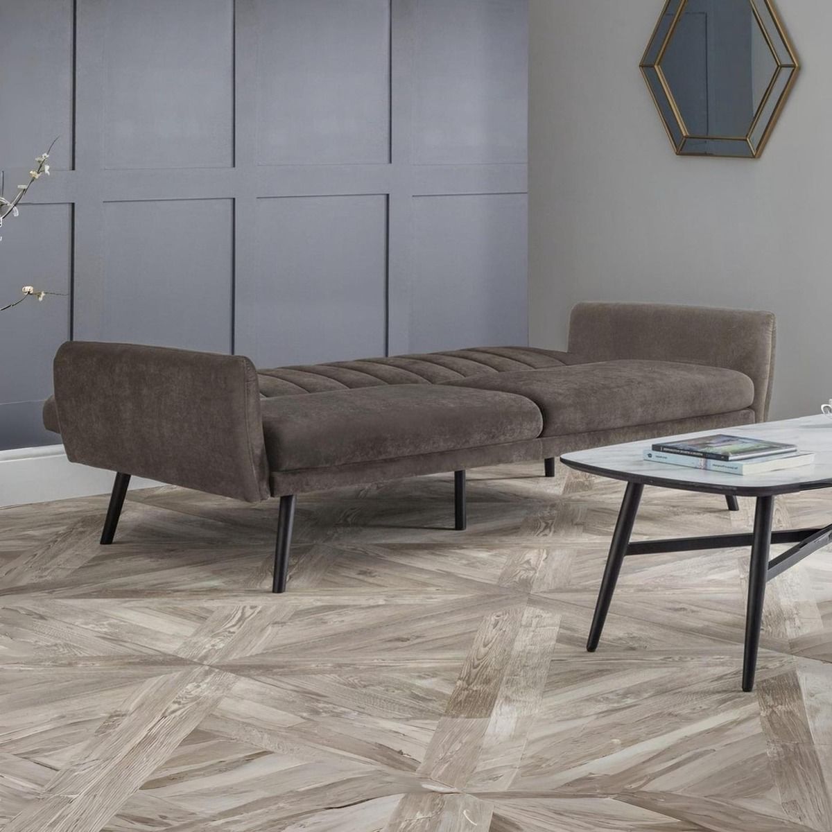 The Afina Sofabed adds glamour to any room, suited for a variety of décor whether glam, modern or mid-century. Upholstered in a luxurious grey velvet with classic statement stitched vertical rows on the back,