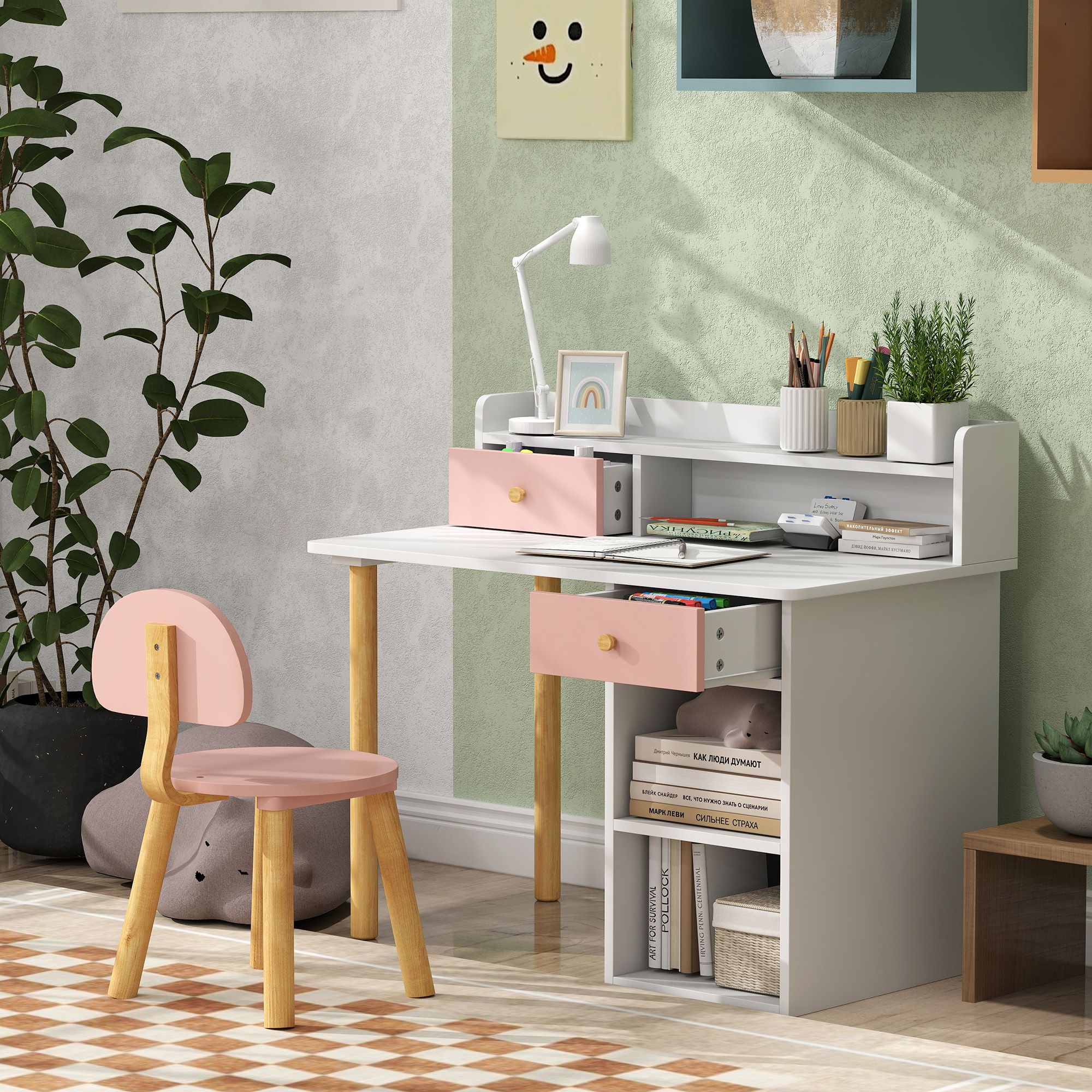 AIVAGO 2 Pieces Children Study Table with Hutch, Kids Desk and Chair Set with Storage Drawer, Shelves - Pink