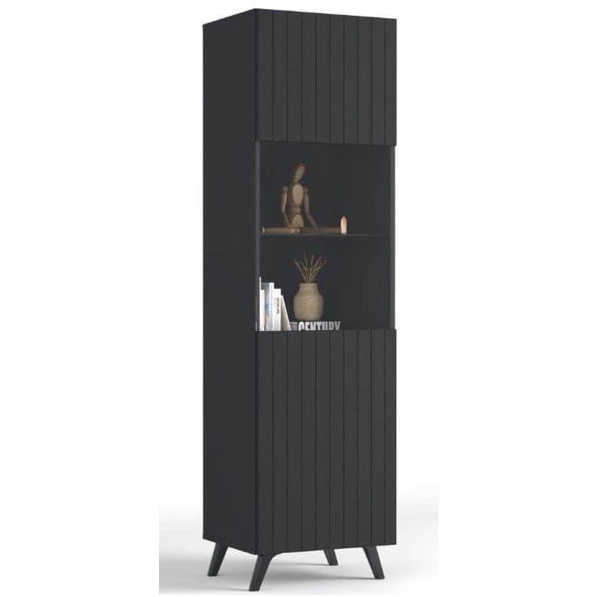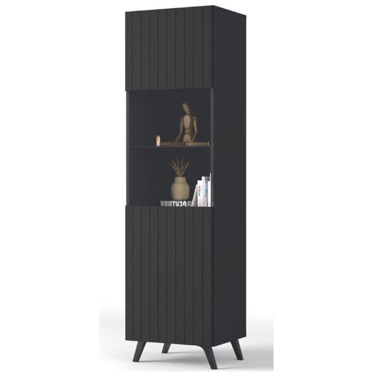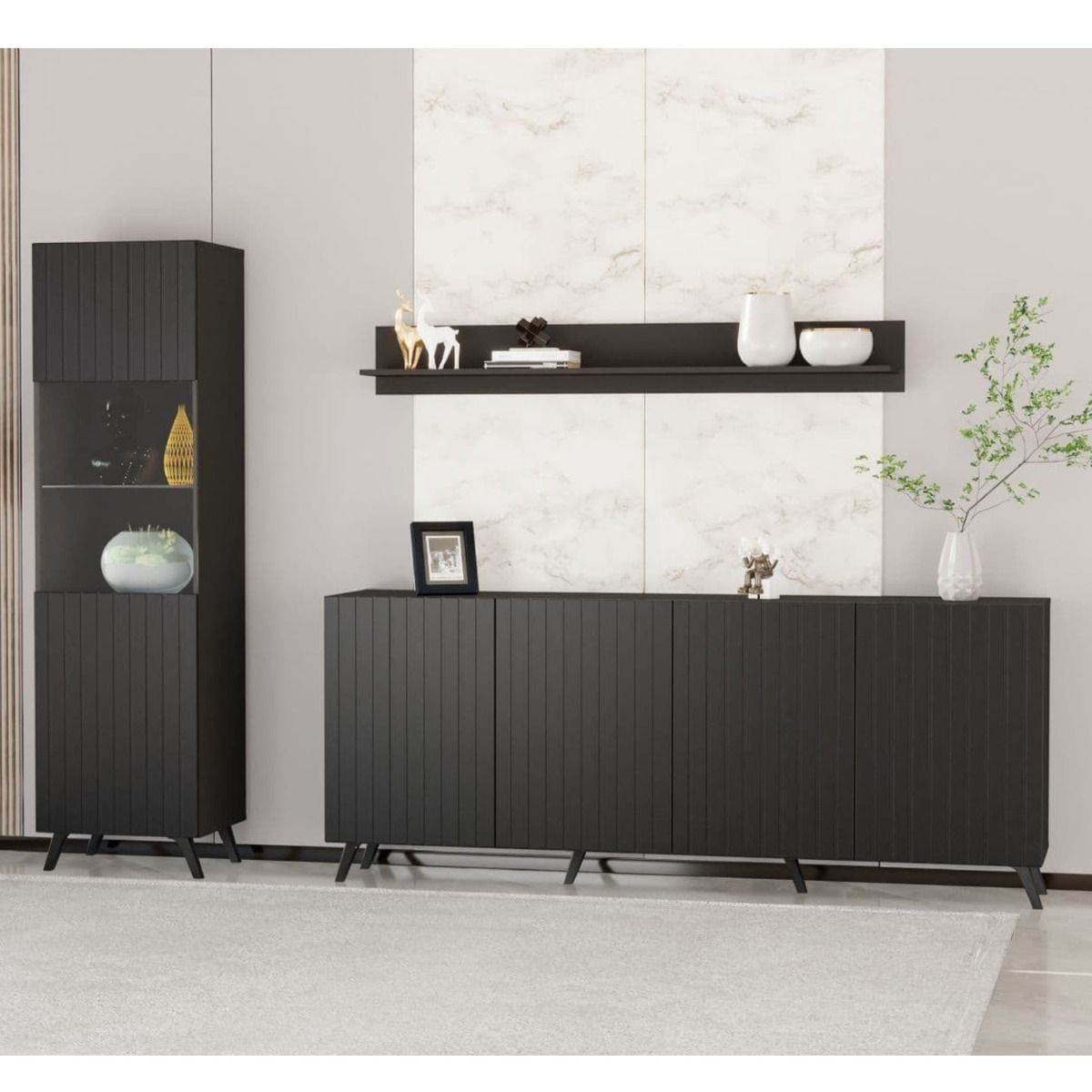 Elevate your home decor with the Alan Display Unit, a sleek and sophisticated cabinet designed to showcase your prized possessions in style. This exquisite piece is meticulously crafted in a stunning Matt Black finish, featuring striking vertical grooved lines that add a touch of modern elegance to any space.