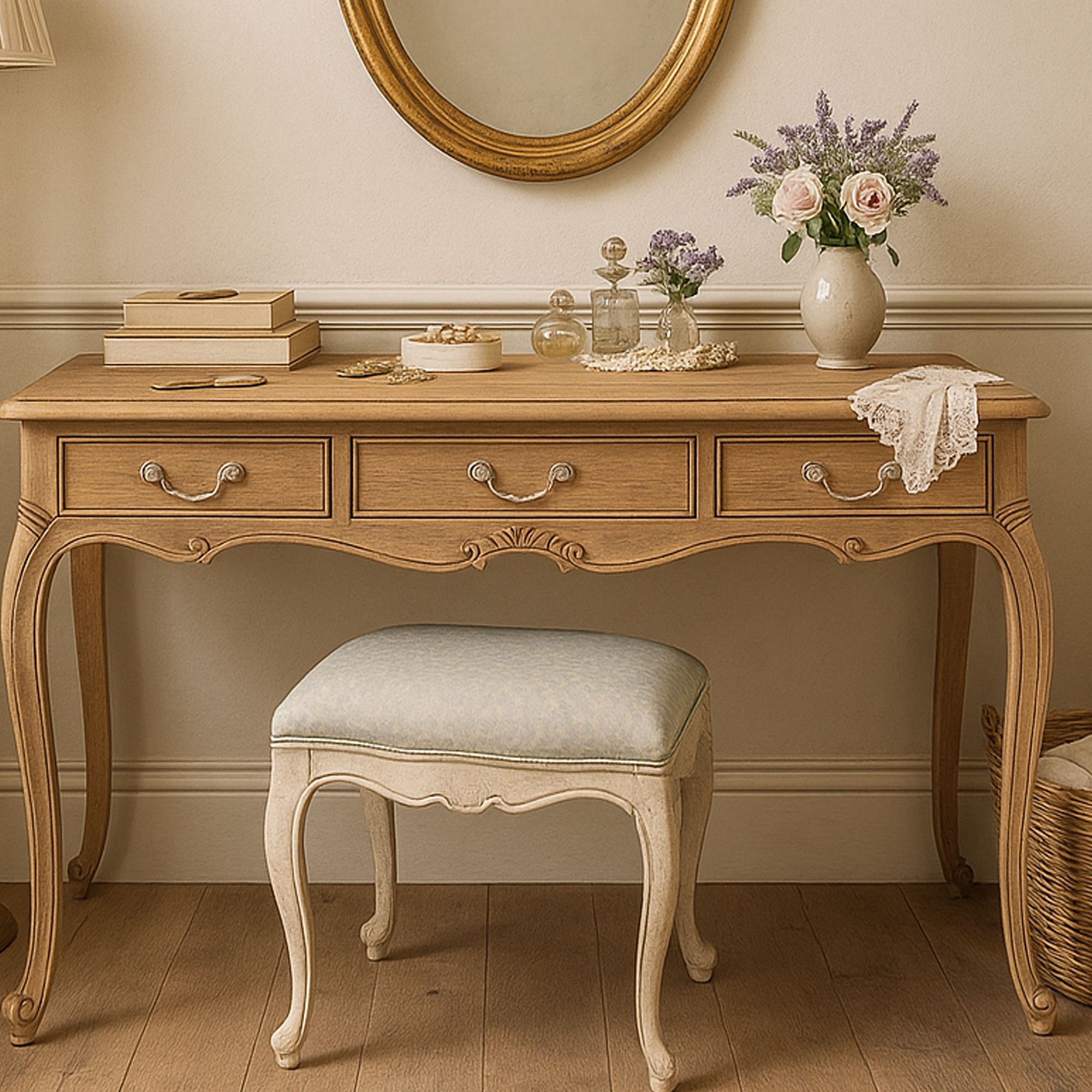 The ALDERBROOK 3 Drawer Dressing Table - Oak Finish offers timeless design and practicality for modern living. Crafted from premium materials, this elegant set provides both function and sophistication. Perfect for placing beside your sofa or bed, the smooth surface is ideal for a lamp, coffee, or decorative piece. Designed with durability in mind, the sturdy construction ensures long-lasting quality while complementing any contemporary or classic décor. A versatile addition to your home that enhances everyday comfort and style.