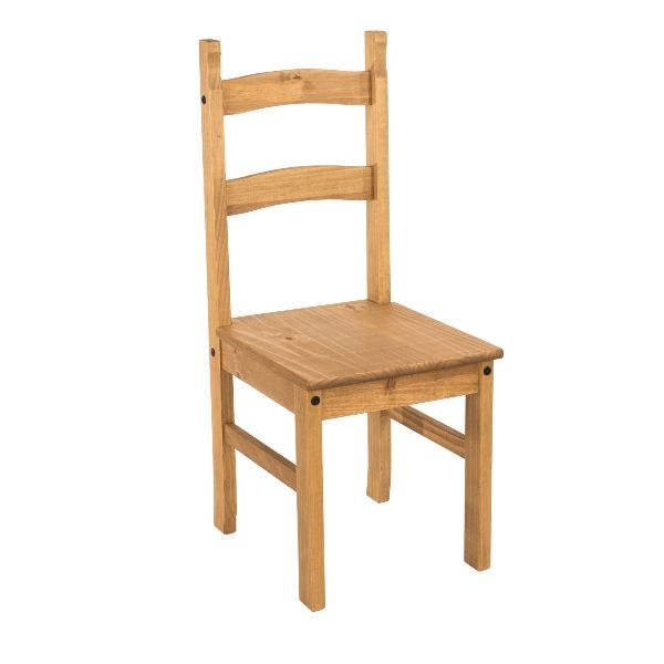 - Set includes six solid pine chairs with antique wax finish and exposed black hardware