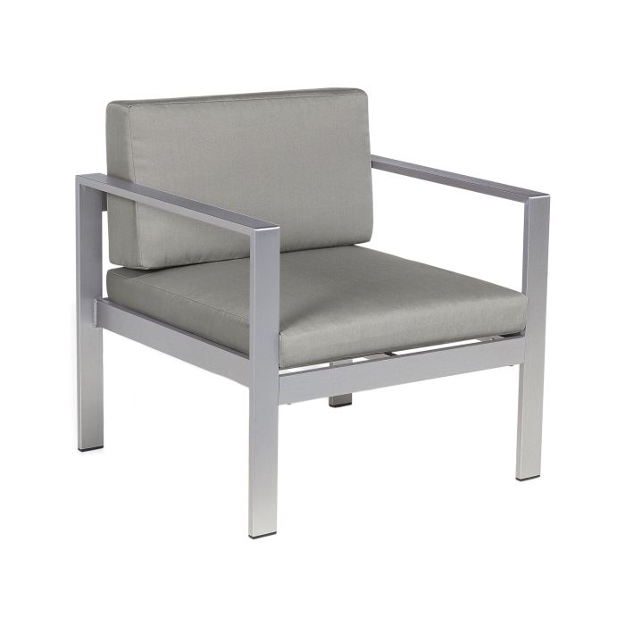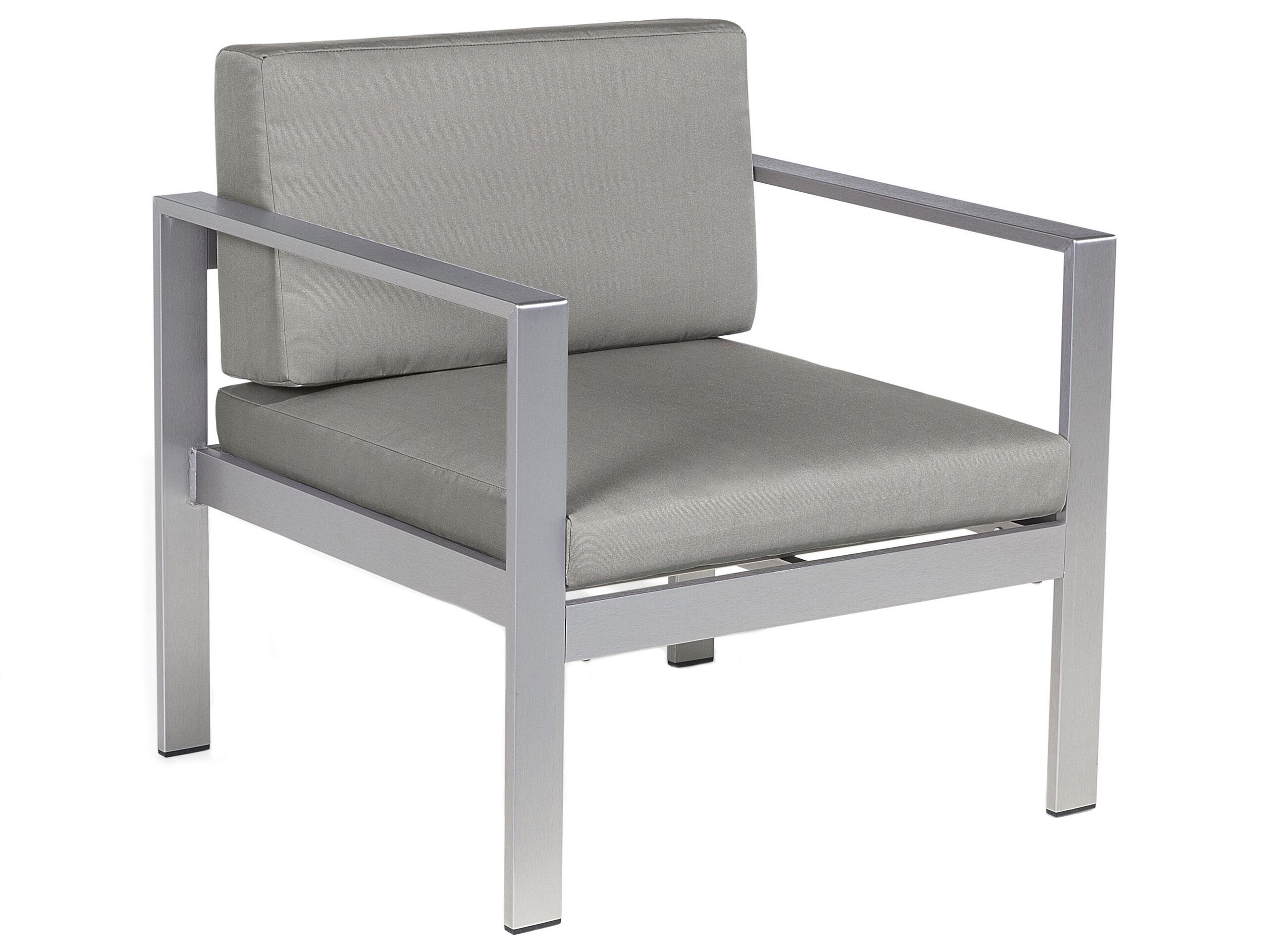 This armchair creates the perfect relaxing spot on your patio. Its minimalistic design based on clean, simple lines blends effortlessly with any garden. Two thickly padded cushions provide the utmost comfort as well as are practical for garden use, upholstered in moist-proof, UV-resistant and stain-resistant polyester. The seat’s neutral grey tone complements any surroundings and looks stylish. The structure of the seat is made from sturdy 100% anodized aluminium, ensuring longevity. Details: Color: Grey. Main material: Aluminium. Additional material: Polyester, Synthetic Material. Material Composition: 100% Polyester Weight: 11 Assembly: Full Assembly Required Weight Capacity: 150 Padding Thickness: 7 Seat Height: 42