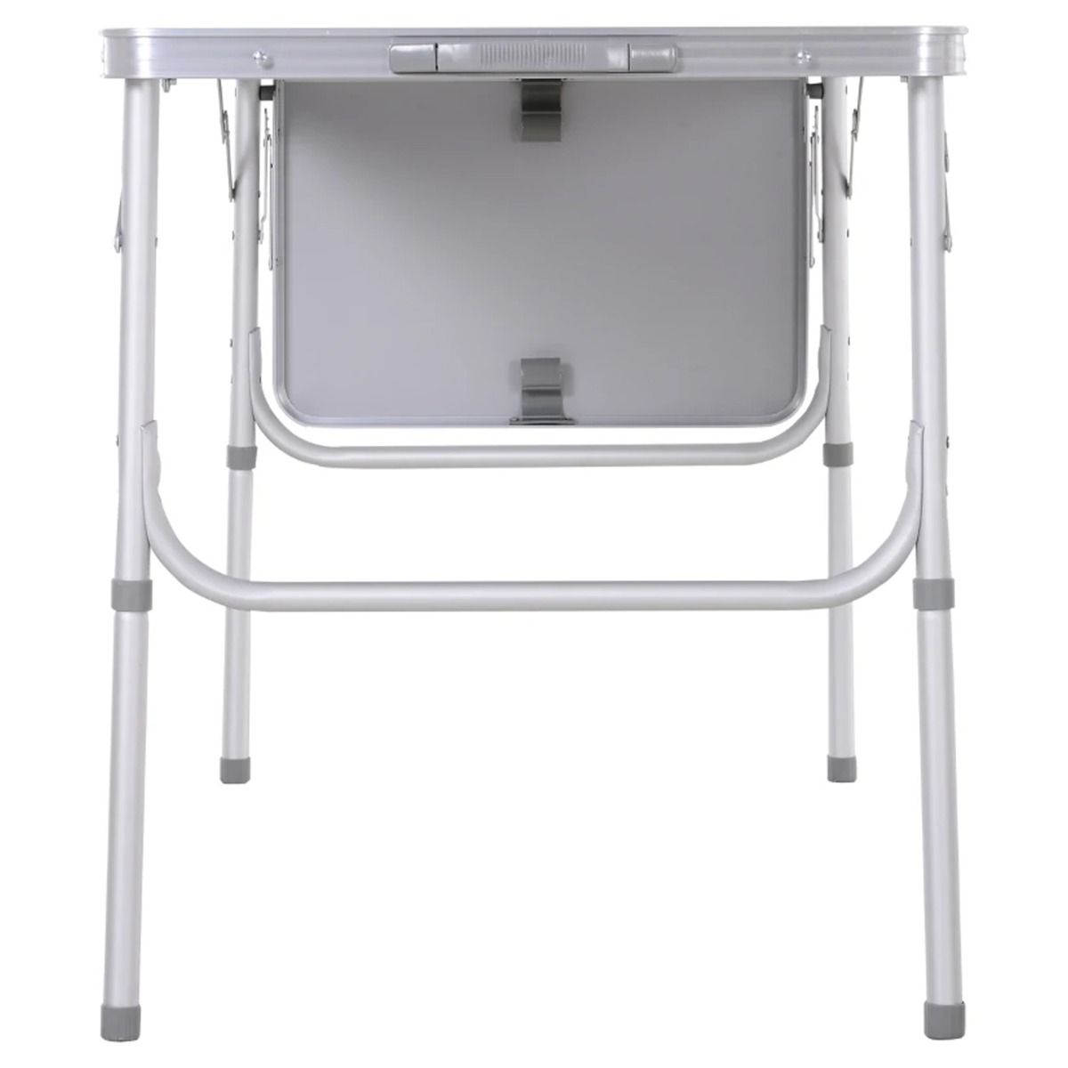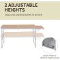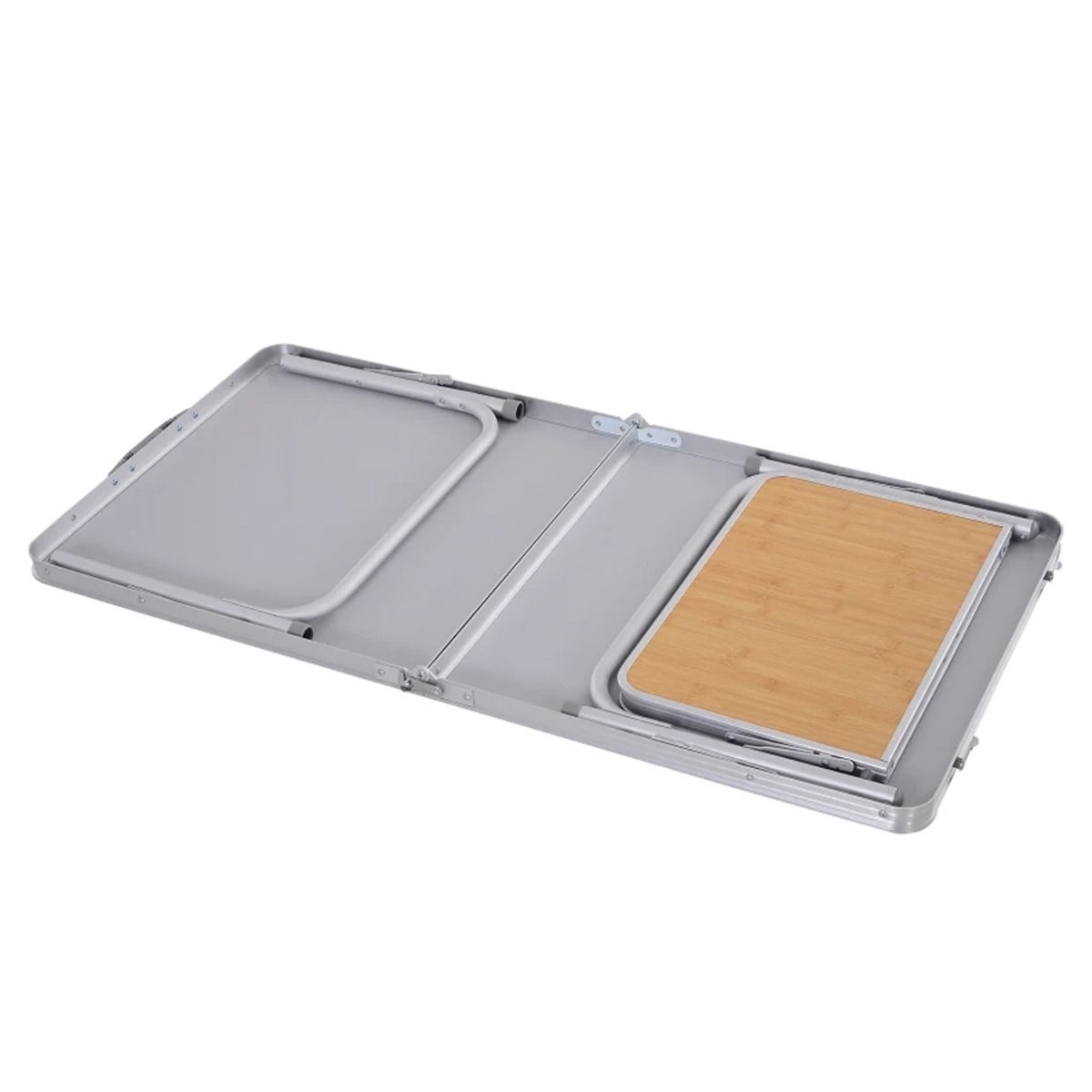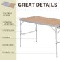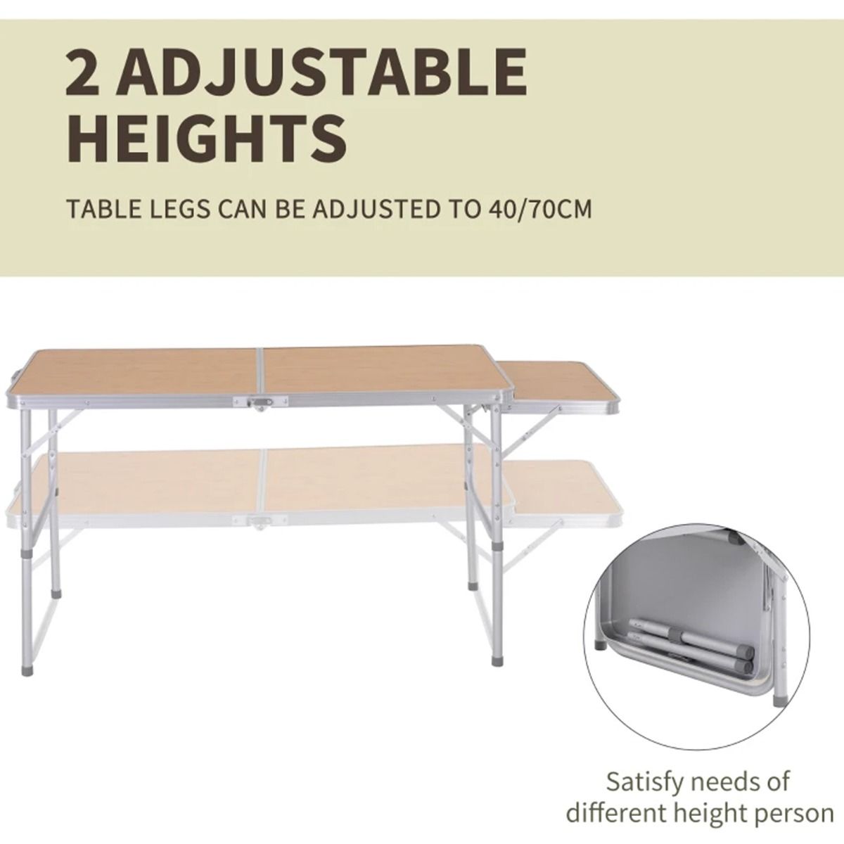Ensure you have the perfect dining spot every time during your camping trips, picnics, festivals and other outdoors with this wonderful table. Foldable in design for easy portability, as well as adjustable to two different heights, it is made using an aluminium frame with four legs, making it lightweight, suitable for outdoor use and reliable, handling a weight up to 30kg – great for eating with your family and friends. With a main tabletop, which is covered an oak coloured MDF top for easy maintenance, it is finished with a small pull-out side table to provide extra holding/dining room if required. Folds into itself – no carry bag case required.