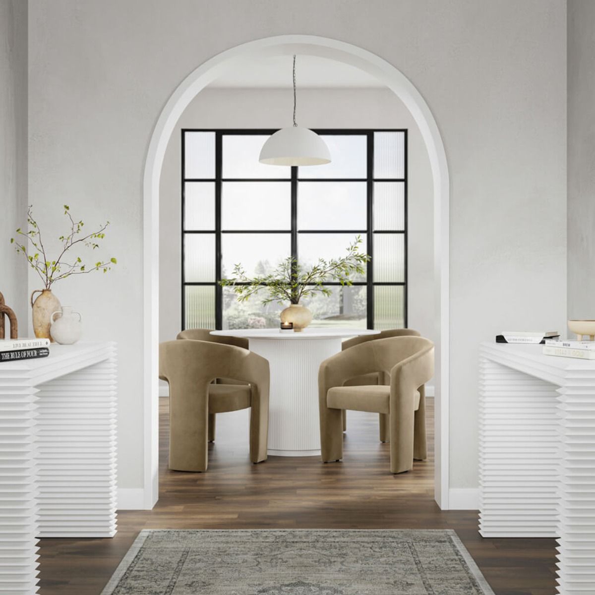 From the Curve collection, the ALUNA is a modern and stylish piece which comes in a comfortable and soft, mole shade of velvet. The sleek design makes a fantastic addition to any dining setting, from modern and minimalist to chic and eclectic. Whether used as a set around a dining table or as a standalone accent chair, the ALUNA effortlessley elevates your space with its contemporary appeal.