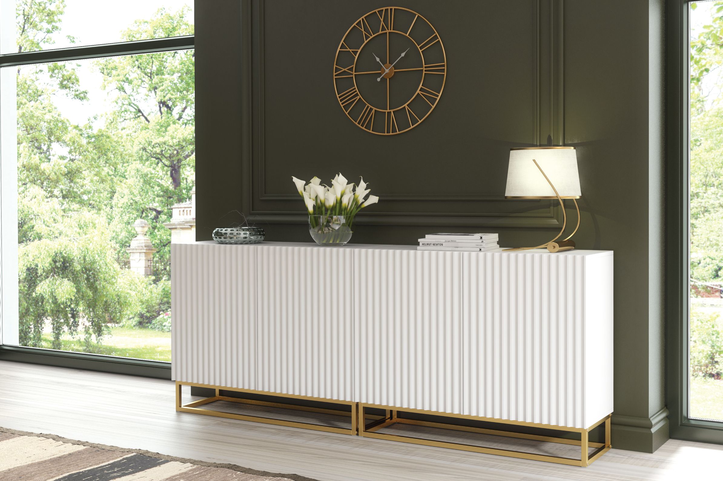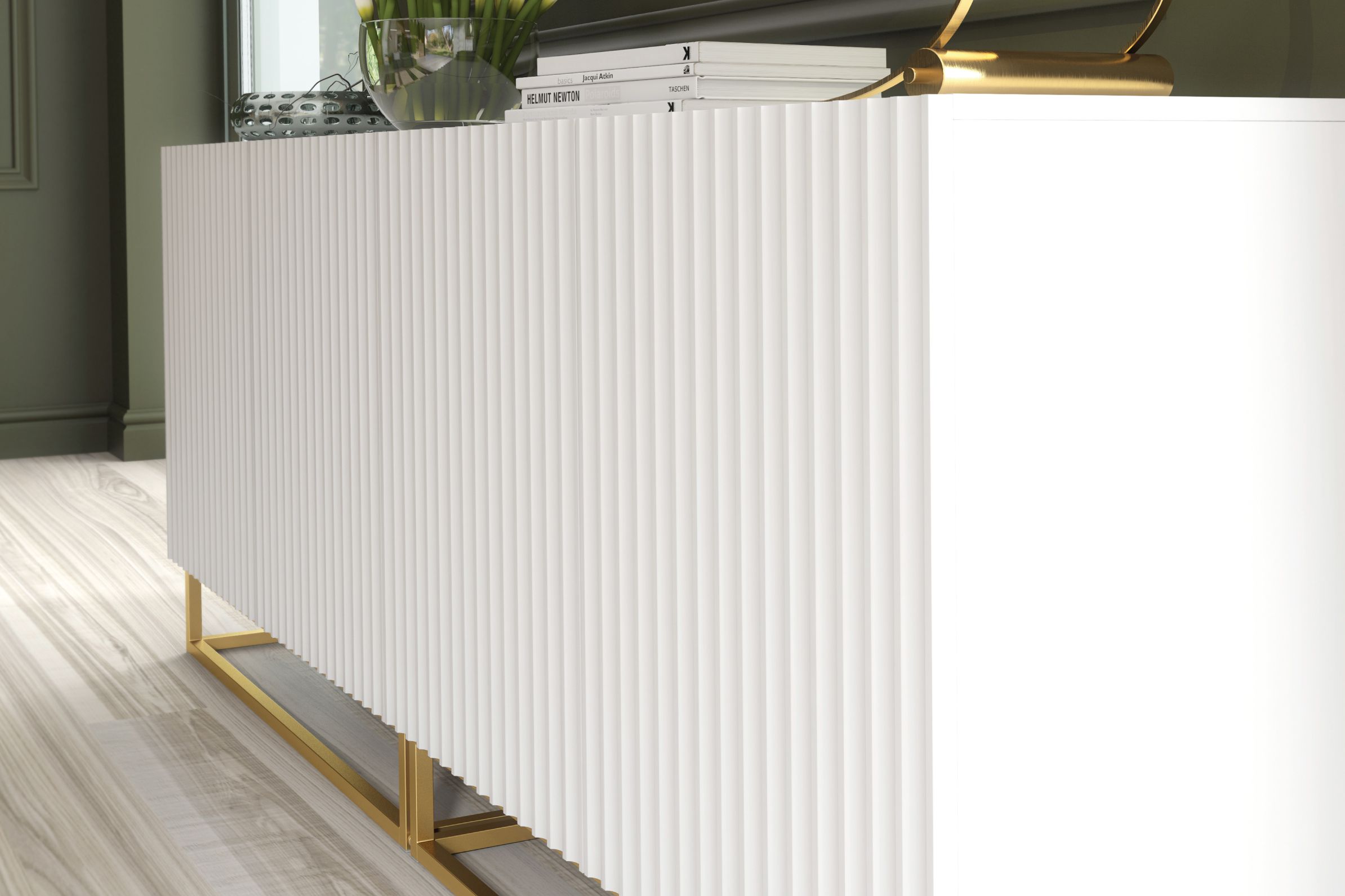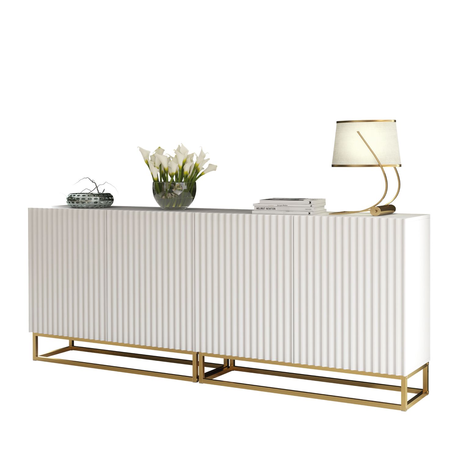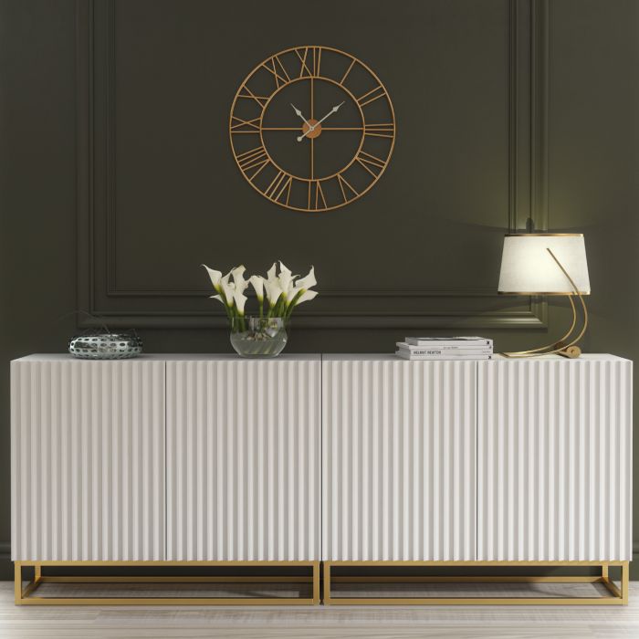 The ANCONA Duo Sideboard is the perfect solution for those who need extra storage and a bold statement piece, consisting of two ANCONA Sideboard units that together provide 200cm of stylish storage while maintaining the same sleek and elegant design. Both units can be placed side by side for a seamless extended sideboard, ideal for larger spaces, or positioned separately in different areas of your home for a cohesive yet versatile look. Each unit measures 100cm (W) x 80cm (H) x 35cm (D) and is crafted from high-quality MDF and chipboard, featuring a wave-textured front for a modern and sophisticated touch. The gold metal base adds a luxurious contrast, while the push-to-open doors ensure effortless access to your belongings. Inside, each sideboard is divided by a central shelf, providing well-organized storage. Available in White, Black, and Dark Grey, the ANCONA Duo Sideboard is a perfect blend of modern elegance and practical functionality, bringing effortless sophistication to any home, whether placed together or apart. This offer includes two units of the ANCONA Sideboard.