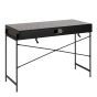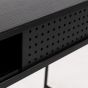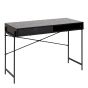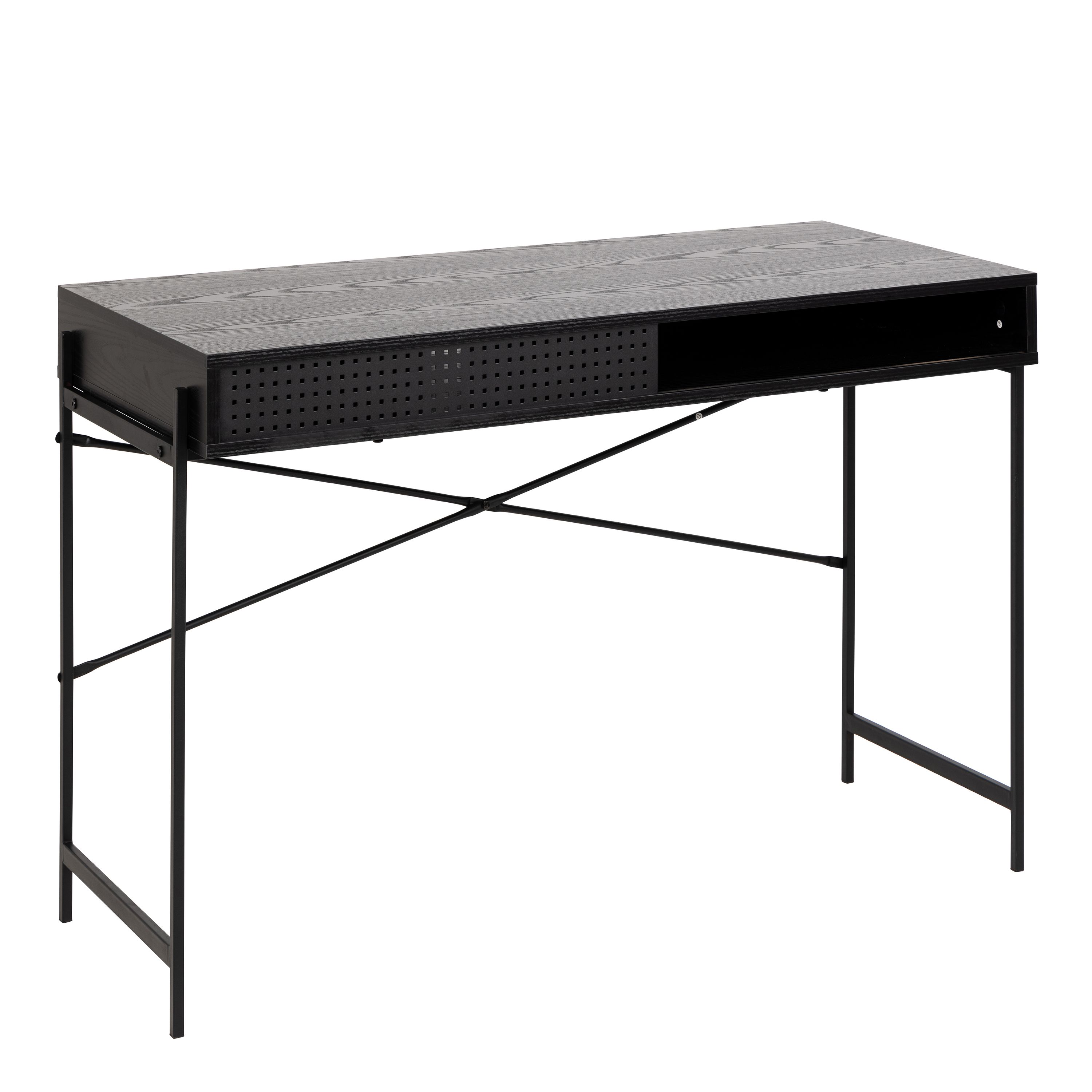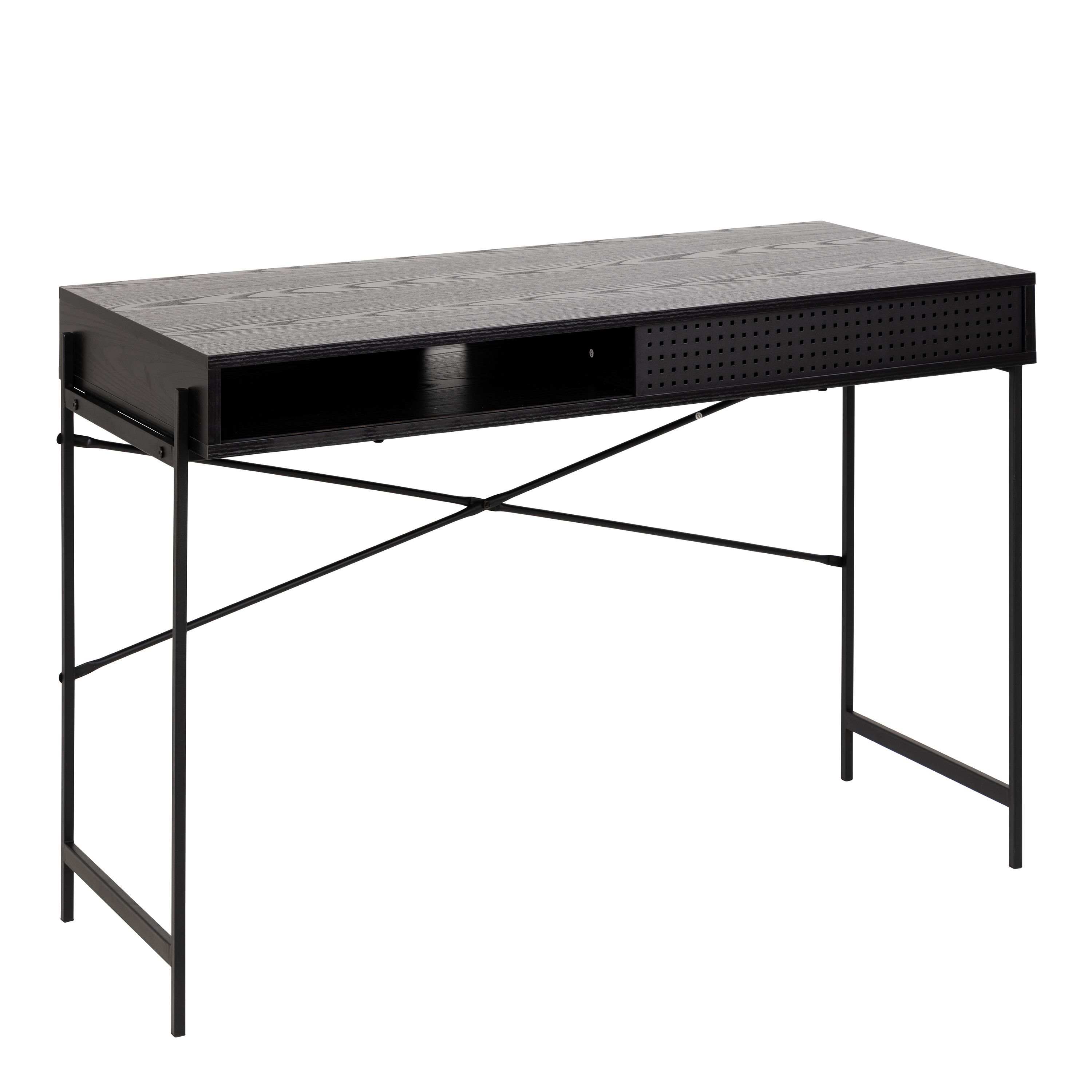 Featuring clean lines and a sleek build, this desk is a minimalist addition suitable for any office or room. Sturdy powder-coated metal legs provide support to the black ash tabletop, which offers easy cleaning. Utilize the sliding metal door underneath the table to conceal your papers and clutter, maintaining a tidy workspace.