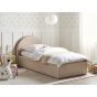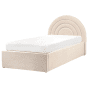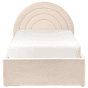 Combining aesthetic design with functionality, this upholstered beige bed is going to be a perfect addition to your children's room, or to a smaller bedroom. The piece, made out of high-quality boucle and durable MDF, will last for many years, even without daily maintenance. Thanks to capacious storage, placed underneath the slats, you'll be able to store away extra pillows or replacement duvets. Its half-round headboard will definitely draw attention, and gives the bed a unique, retro look.
