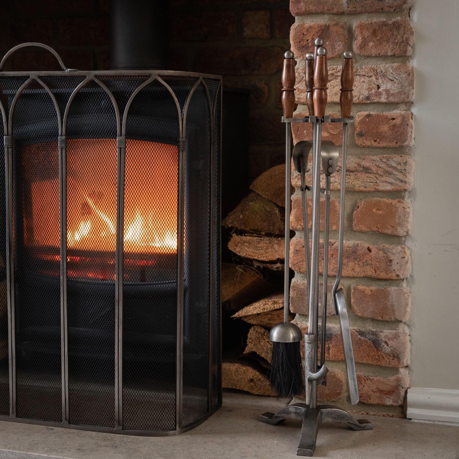 Antique Pewter Hand Turned Fire Companion Set With Wooden Handles