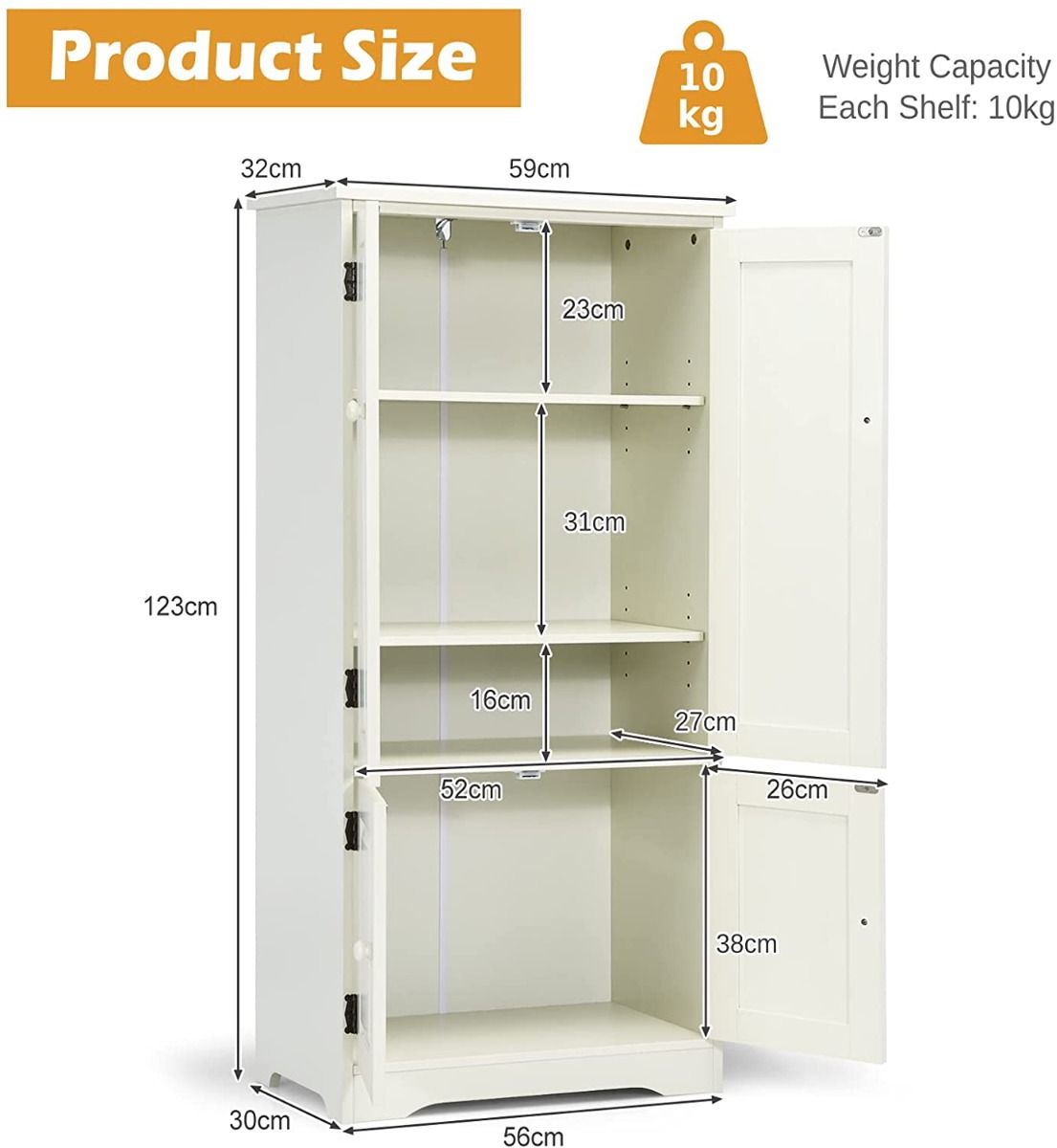 Looking for a storage cart to hold more items at your home or office? The floor cabinet is a great solution for your storage needs. With large storage space and doors ,the floor cabinet provide enough room for your daily essentials. The height of the shelves are adjustable to customize your needs, so arrange the things as you like. The safety and endurance of the pantry is assured by the use of high-quality material and elaborate craftsmanship. An ideal storage floor cabinet that can be used in kitchen, bathroom, living room or office. This versatile storage cabinet is worth having at your place, so order yourself a one now and enjoy the credits of enough storage space. Large storage space with doors for keep the dust out Adjustable shelves allow for display and storage of food boxes, dishes, books Delicate knobs for easy open and close Remove all of the shelves to create a large single space Can be used in any room including the kitchen, bathroom, bedroom, hallway, etc. Elegant design becomes a functional centerpiece in any room Perfect height of the cabinet for easy access to the items Easy assembly with clear instruction