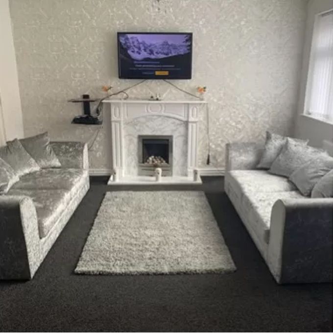 Beautiful, lovely silver sofas that light up the room with their shimmer. So glad I got them on sale before they went out of stock! Amazing! Matches my wallpaper and rug and goes amazing against the black carpet we have ❤️