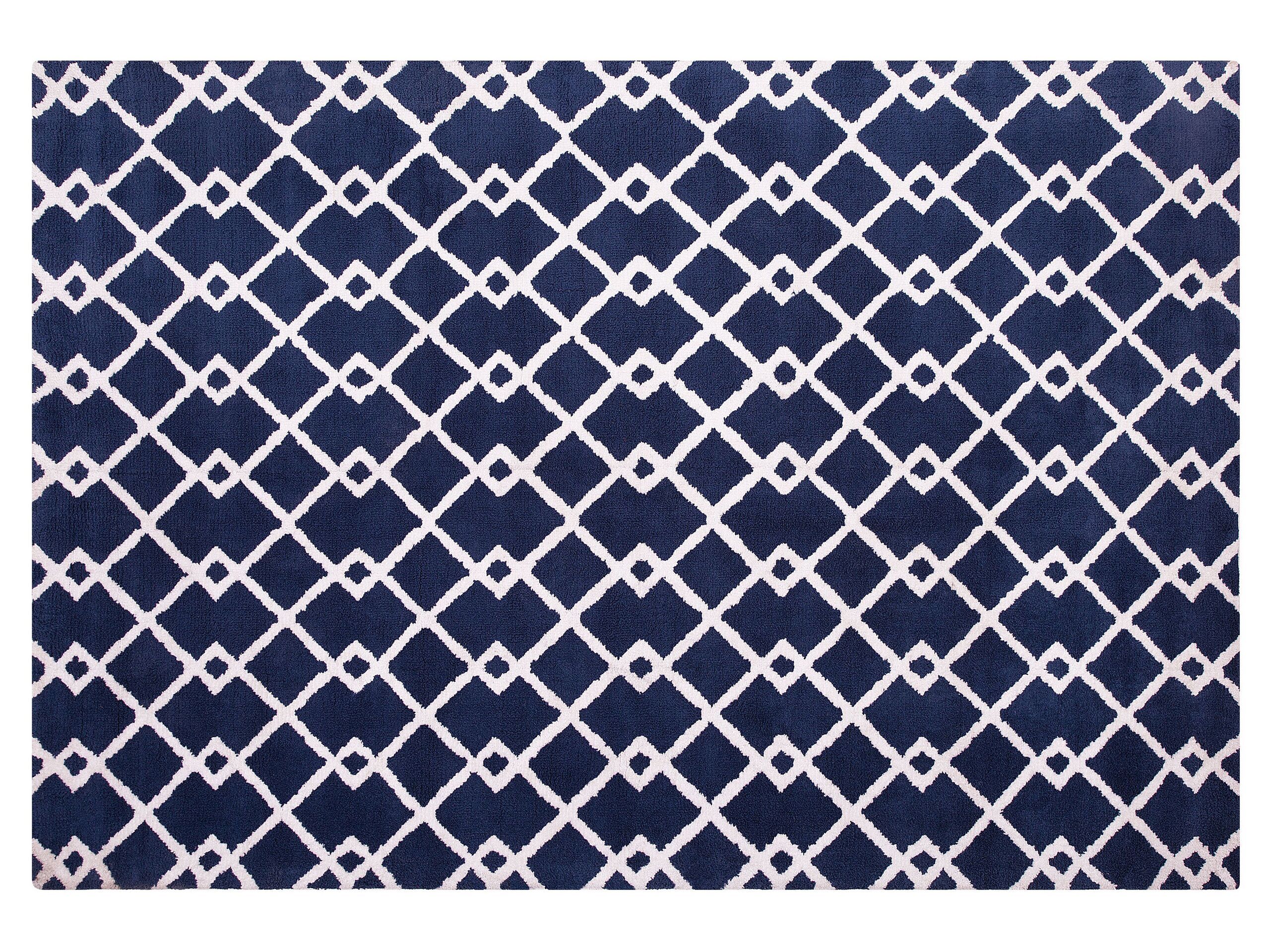 An updated version of a traditional geometric design, this rug will beautifully complement any bedroom, living room or hall in a modern or traditional style. Made of high-quality polyester, it is soft, easy-care and long-lasting. The stylish, contemporary pattern on a calm blue background fits into any domestic setting. Details: Color: Blue, White. Main material: Polyester. Material Composition: 100% Polyester Weight: 7 Assembly: Does Not Require Assembly