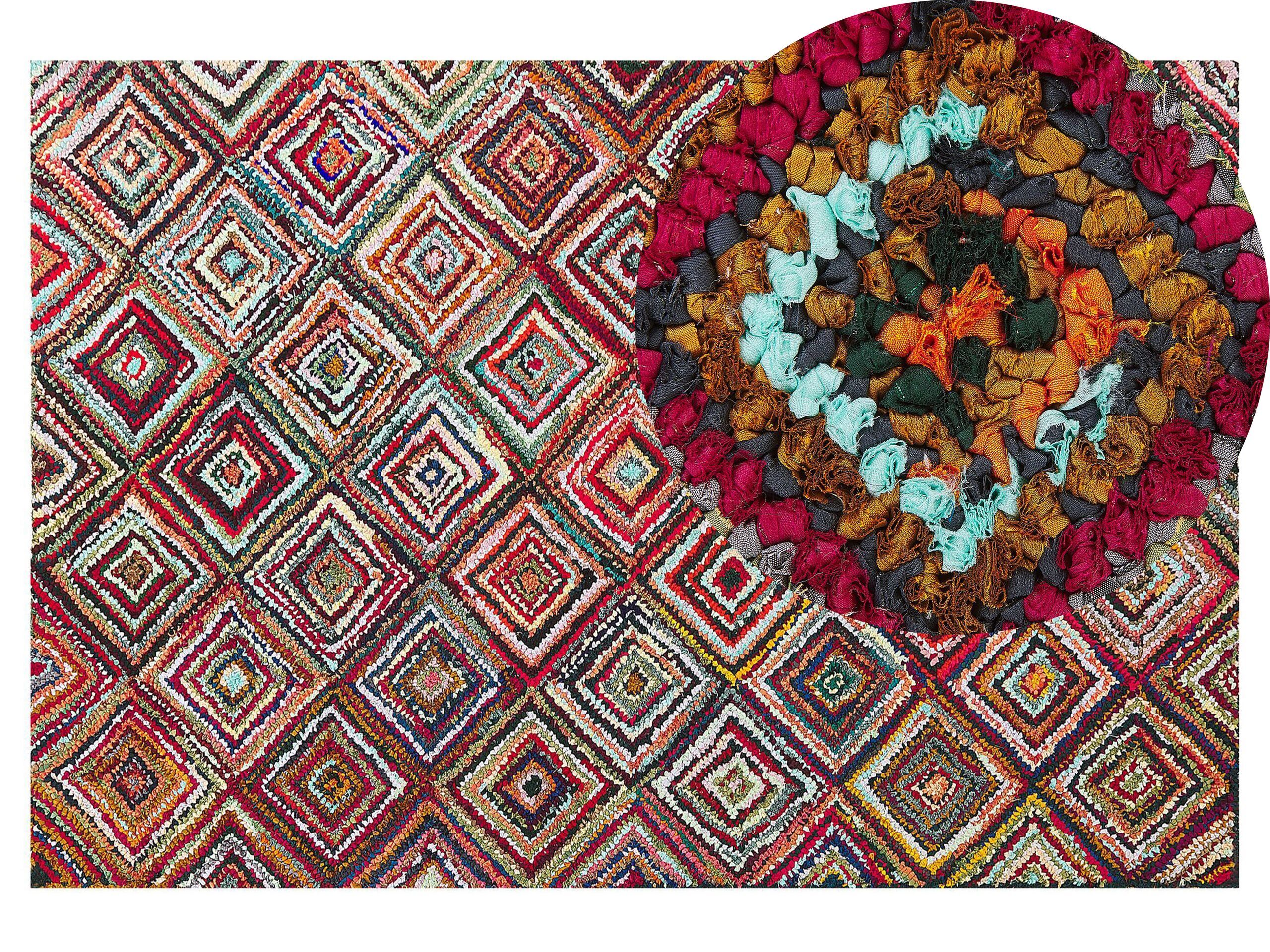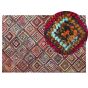 Enhance your home interior with this boho area rug, suitable for any modern and eclectic decor. Handwoven using a combination of cotton and polyester, the rug is exceptionally soft and durable to withstand prolonged usage. Colourful, geometric pattern grabs attention while introducing a warm, cosy feel to a room. Perfect accent piece for a living room, bedroom or kids room set-ups. Details: Color: Multicolour, Purple, Blue, Red. Main material: Cotton. Additional material: Polyester. Material Composition: 60% Cotton, 40% Polyester Weight: 12 Assembly: Does Not Require Assembly
