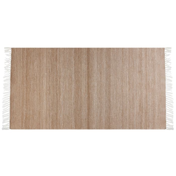 A carpet like this is the perfect finishing touch of an interior as well as outdoor space like terrace or patio. Hand-woven using recycled plastic fibres, it is easy to clean and durable, making it suitable for high-traffic areas. Synthetic fibres rugs are a good solution for homes with pets and allergy sufferers because they do not collect dust. This flat-woven piece features a wool-like texture that is pleasant to the touch and thanks to its neutral colour, it can be easily matched with many interior styles. Details: Color: Beige. Main material: Synthetic Material. Material Composition: 100% Polypropylene Weight: 1.4 Assembly: Does Not Require Assembly
