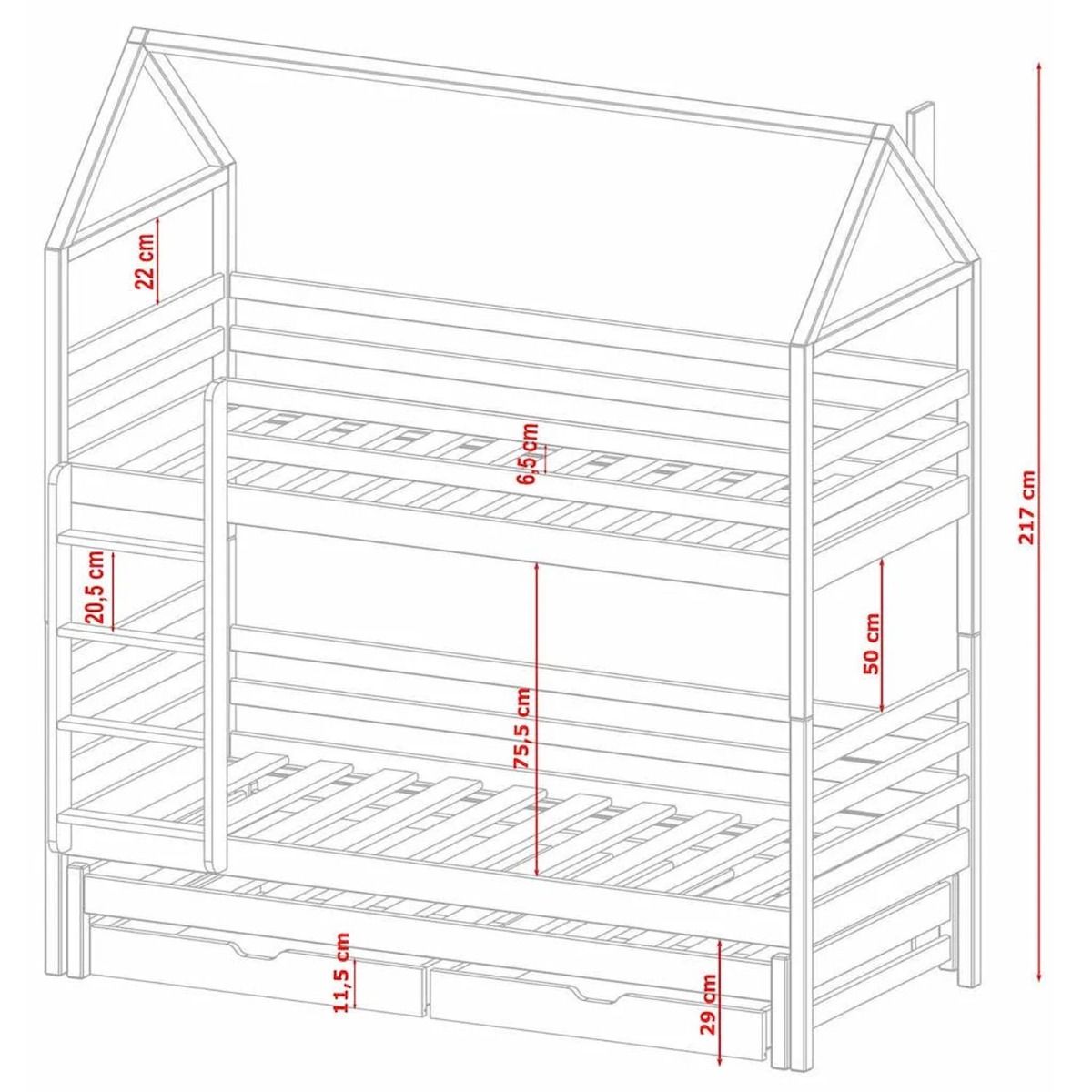 Transform your child's space with the Arthur Calix Bunk Bed – a perfect combination of style, versatility, and safety. Crafted from solid pine wood and adorned with a three-layered water-based paint, it ensures durability and health-conscious design. The universal ladder offers flexible placement, and non-removable safety guards provide added security. This bunk bed effortlessly converts into three separate beds, offering adaptable sleeping options. With a slatted bed base made of pine wood, under-bed storage, and a trundle bed designed for a foam mattress, it's a practical and stylish choice.
