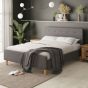 The perfect choice for a contemporary home, this retro-inspired bedframe personifies effortless chic. The simple padded frame is supported on pale wooden legs and covered with smart grey hopsack. A neat, buttoned headboard showcases restrained modern style. A great match for a no-fuss, minimalist setting and can be accessorised with colourful fabrics and linen to suit.