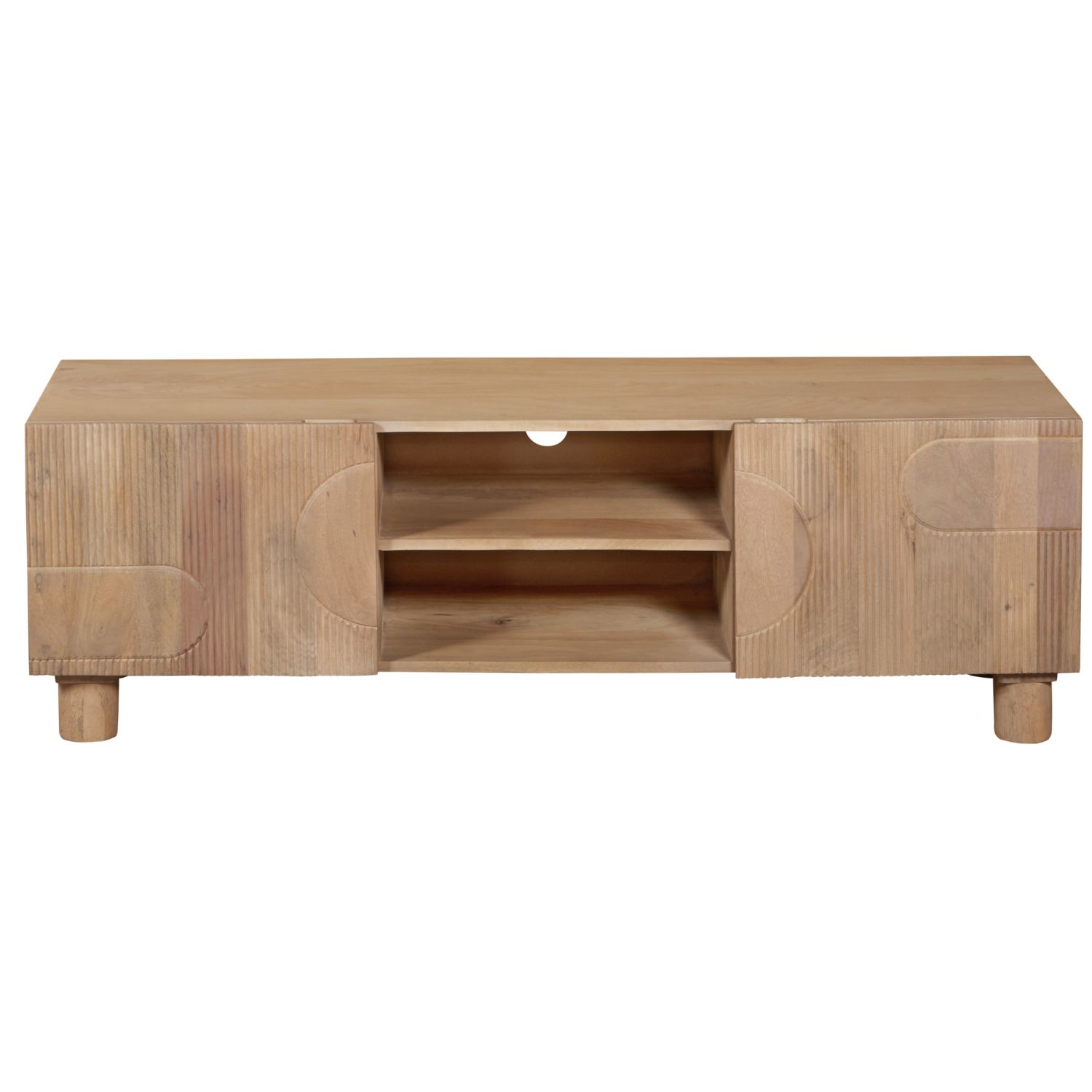 Introducing our stylish and functional TV cabinet, designed to accommodate your entertainment needs while adding a touch of elegance to your living space. Crafted from high-quality mango wood, this TV cabinet features a light brown finish with a water-based lacquer that enhances its natural beauty. The cabinet is designed to hold TVs up to 60 inches and includes ample storage for media boxes, DVDs, and other accessories. The fluted pattern on the cupboard doors adds a unique and eye-catching detail, making this piece a standout addition to any room. With partial assembly required, this TV cabinet is both practical and aesthetically pleasing.