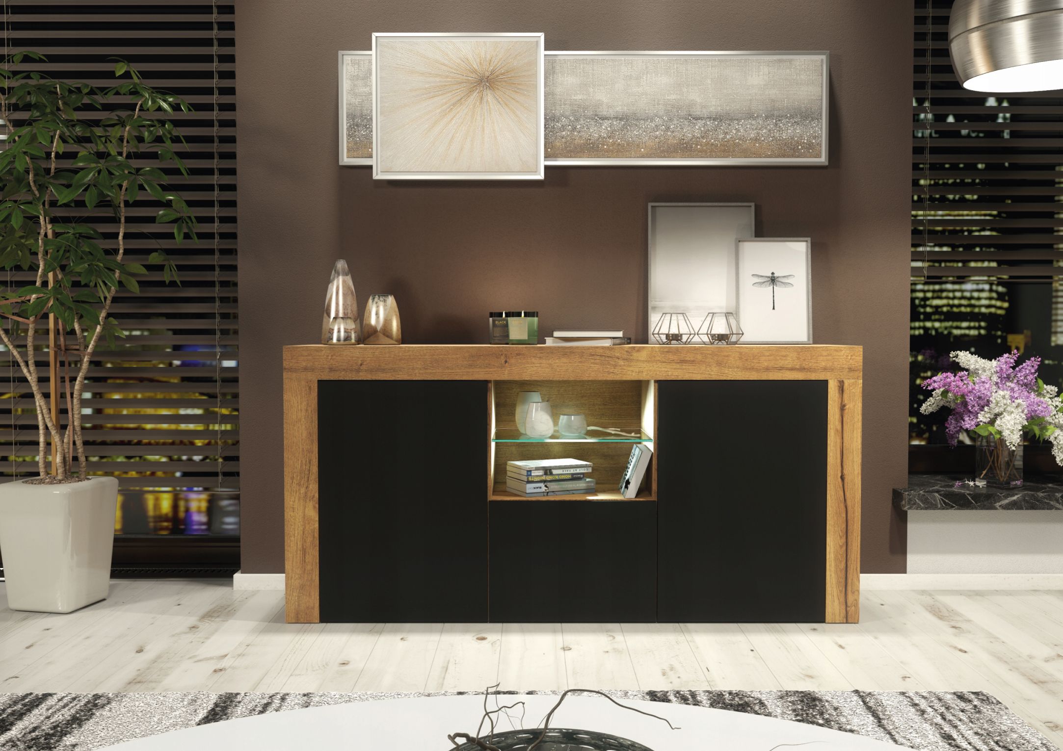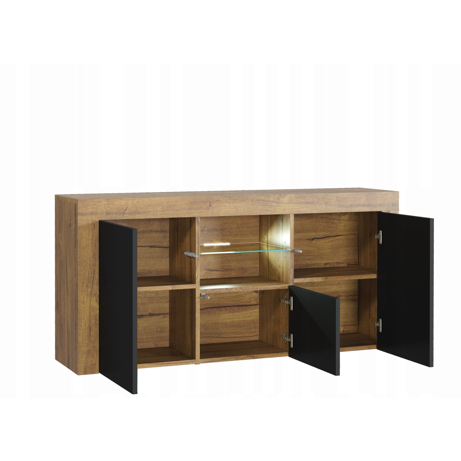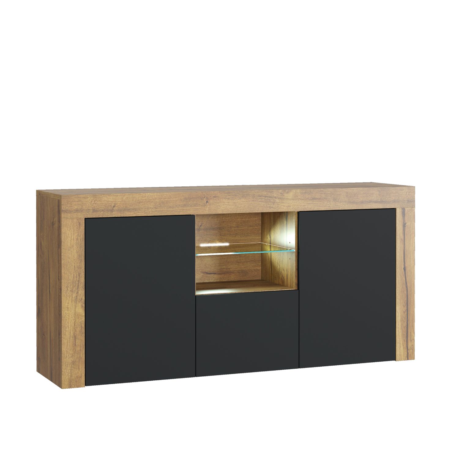 The ASSENS Sideboard strikes the perfect balance between modern design and practical storage, serving as a sleek and stylish addition to your living space. Measuring 145cm (W) x 70cm (H) x 35cm (D), this versatile piece combines contemporary elegance with everyday functionality, making it an excellent choice for any home. The design features two push-to-open doors on each side, concealing spacious compartments with internal shelves to help you stay organized and keep your space tidy. The smaller central doors provide additional hidden storage, ideal for stashing away clutter or everyday items. At the heart of the sideboard, an open compartment divided by a sleek glass shelf offers ample space for media devices, decorative items, or household essentials. Please note: the Oak with Black version features matte black doors, providing a unique and understated alternative to the glossy finishes available in other options. Available in White & Gloss Doors, White & Grey Gloss Doors, Black & Gloss Doors, Walnut & Black Gloss Doors, Oak & White Gloss Doors, Oak & Black Matt Doors, and Dark Grey & Gloss Doors.