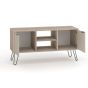 Industial styling and functional, this TV unit features plenty of storage in a combination of driftwood and calico effect finishes in easy to clean melamine with plastic pull handles and metal feet.