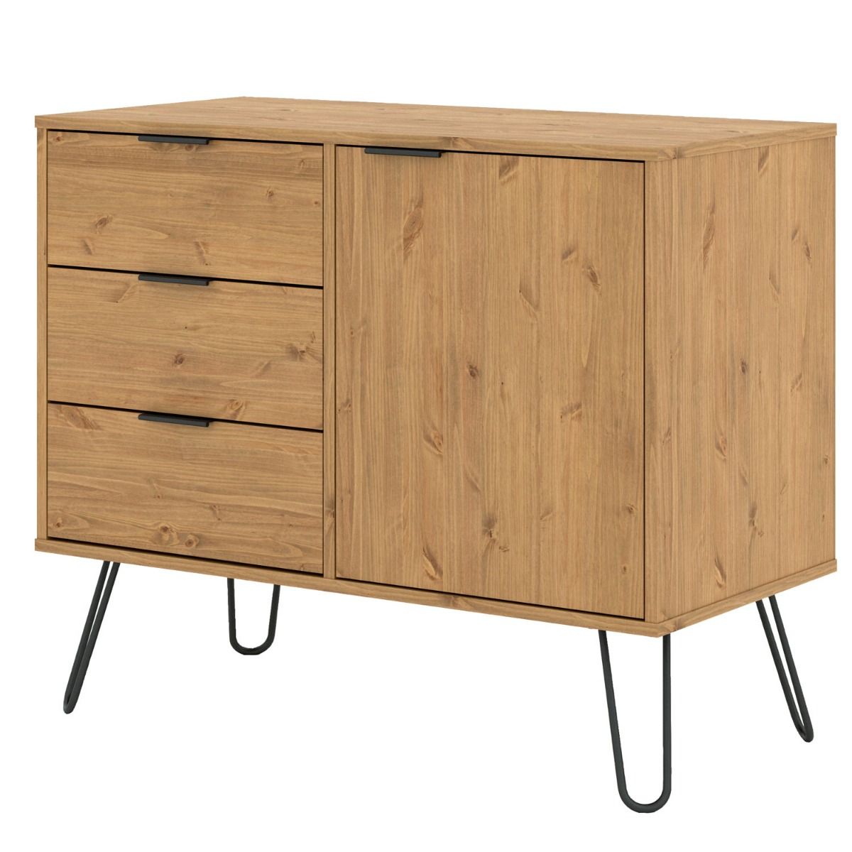 Our compact industrial styled small sideboard offers plenty of drawer and cupboard storage in an attactive wax finish with real metal.