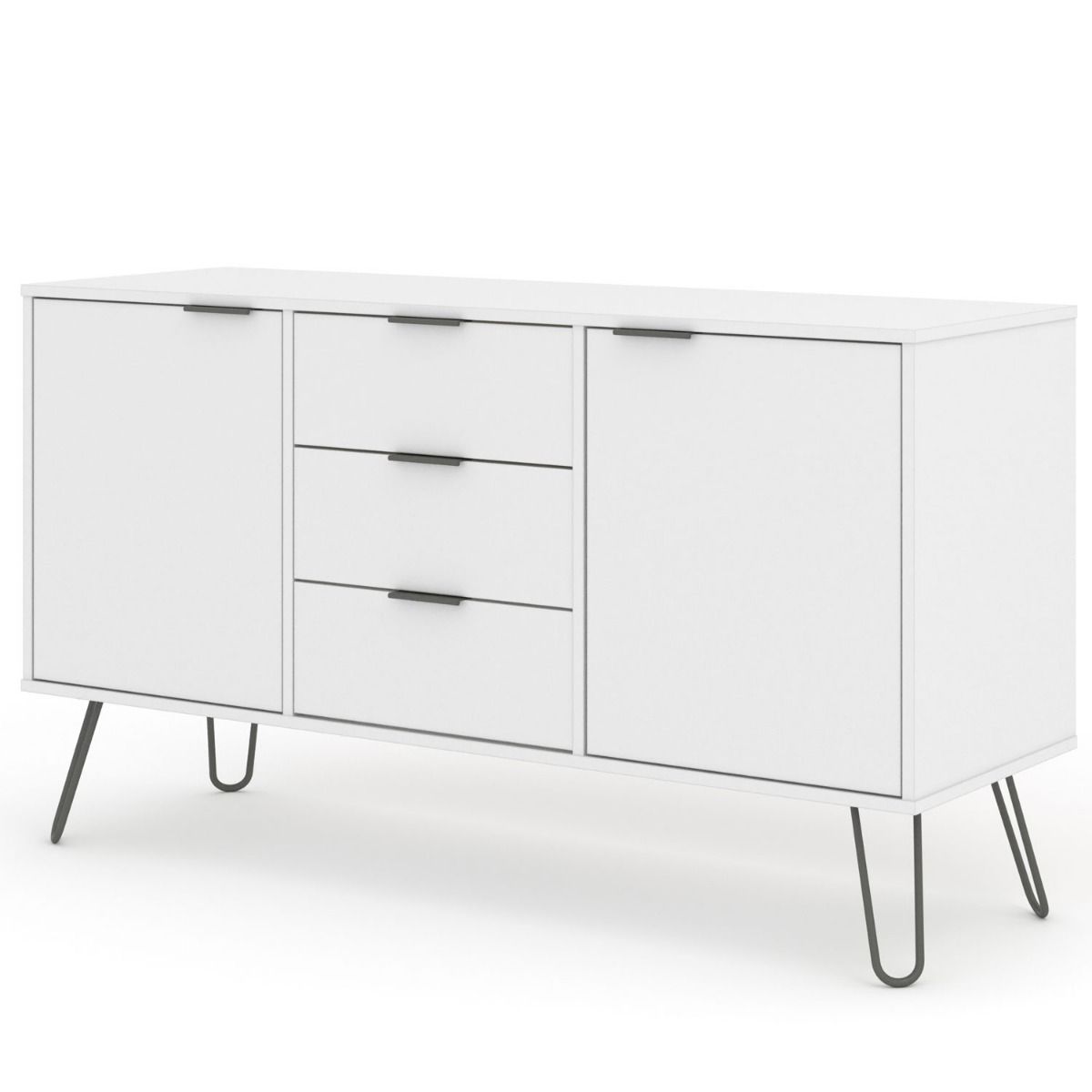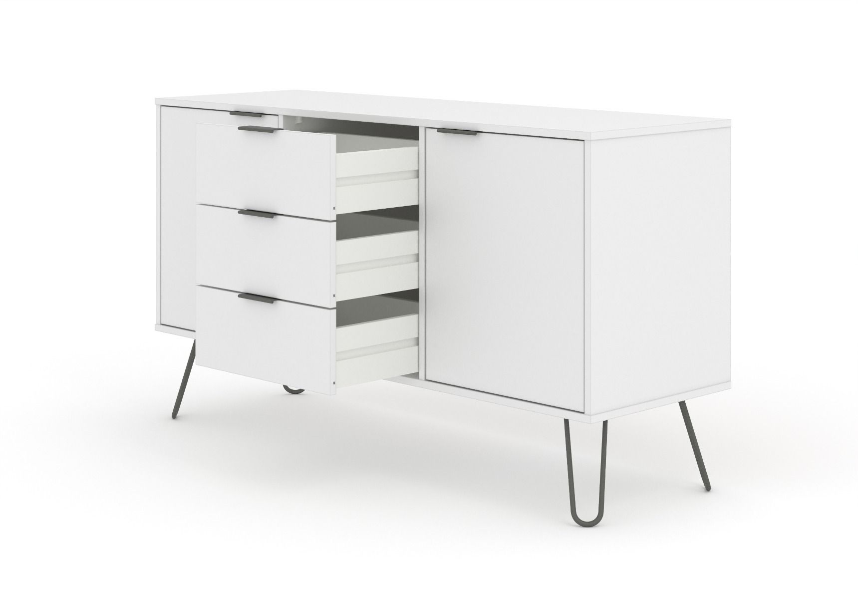 A great combination of drawer and cupboard space, our industrial styled medium sideboard is finished in an easy to clean crisp white textured melamine finish with plastic pull handles and metal feet.