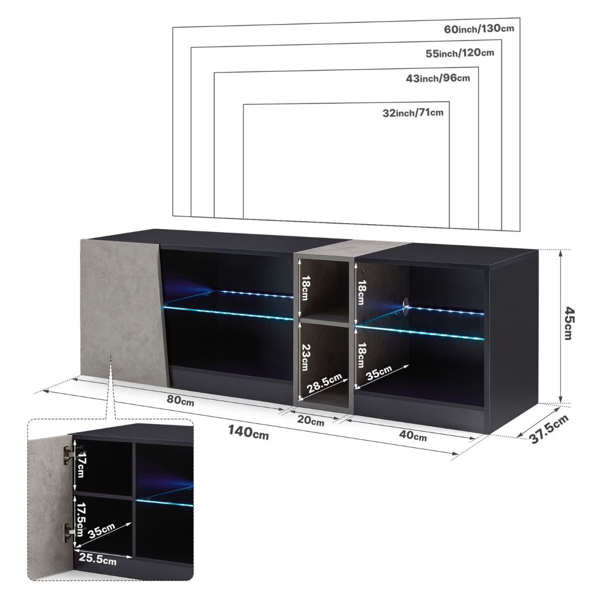 AuraView TV Stand with 5 Open Compartments and 1 Door RGB Lights