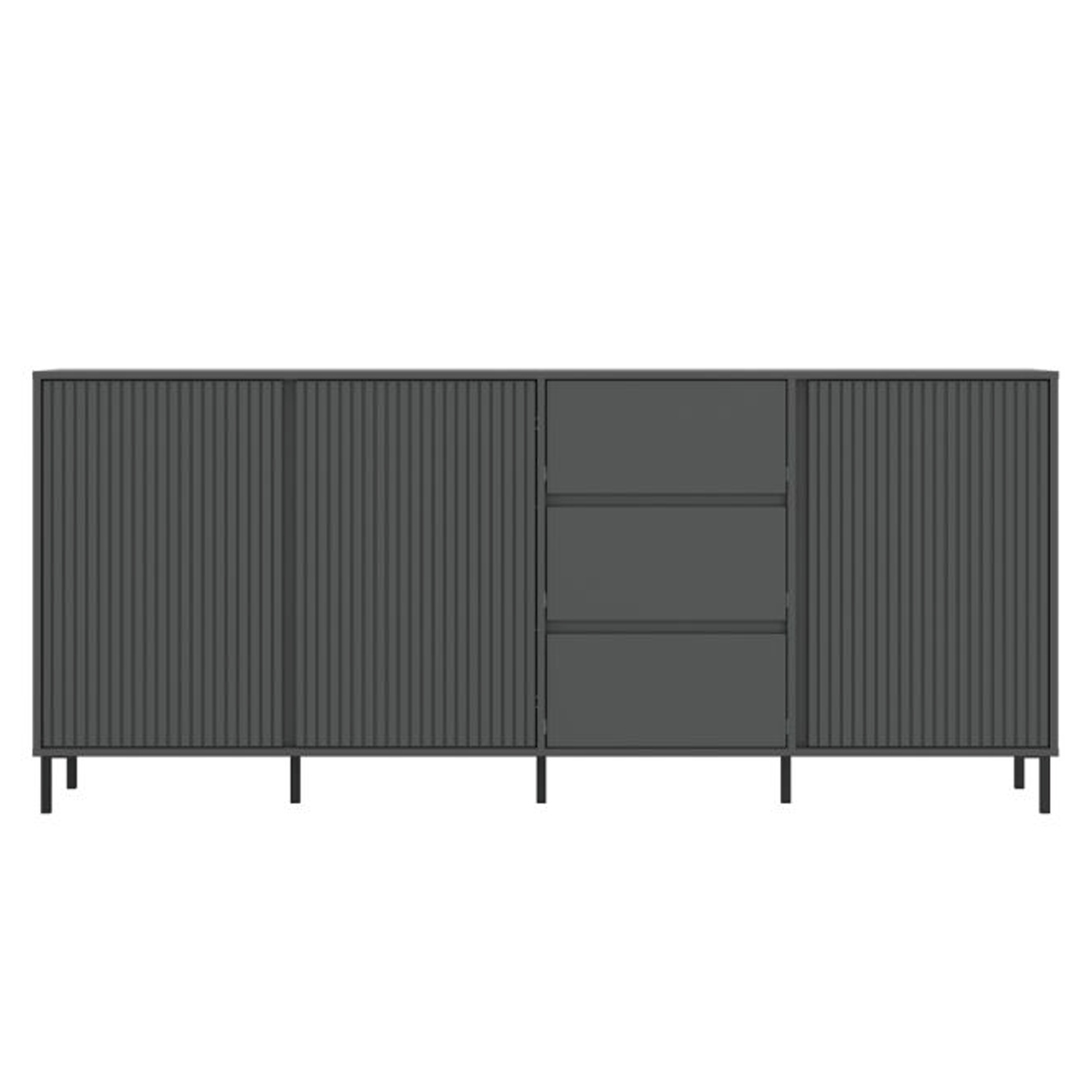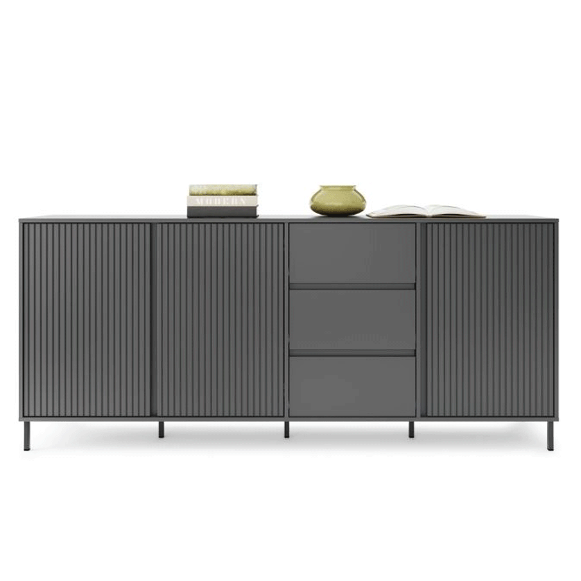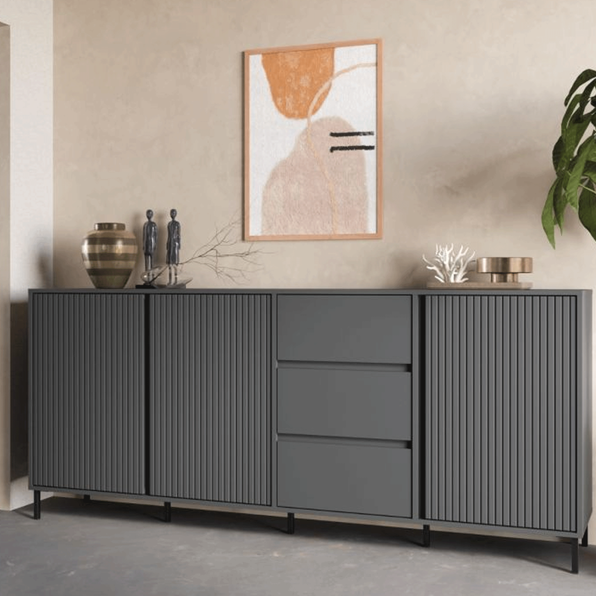 The AURELITH Grey Sideboard with 3 Doors and 3 Drawers provides generous storage with a bold, modern look. Textured fronts add visual interest, while handle-free design maintains a sleek profile. Ideal for living and dining areas needing style and organisation.