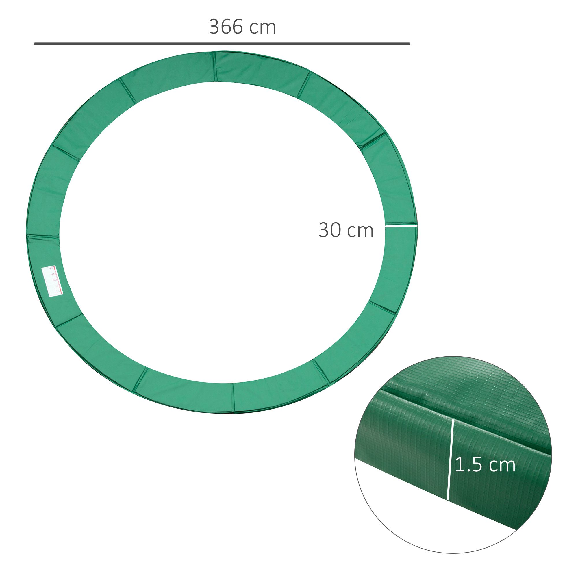Fitting for 12 ft trampoline frame. High quality, uv resistant pvc on the top and heavy duty pe on the bottom. 15 mm thick epe closed-cell foam inside for shock absorbent platform. Safety pad is waterproof. It can protect all metal springs on rainy days. Overall size: 12ft This product is designed to deliver durability, functionality and reliable everyday performance, making it a practical solution for modern homes and gardens.