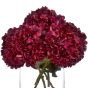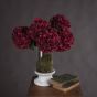 A single stem of large headed hydrangea in rich ruby tones, perfect for the autumn season. Display an odd number in a vase of your choice to bring instant cosy autumn vibes to a space, or mix with some autumned toned foliage for a fuller bouquet. This bloom also works especially well with the Burgundy Peony Rose for a full vase look. Regular floristry points along the wired stem of these beautiful faux flowers make trimming them to length simple (wire cutters recommended) or in many cases you'll find can bend them to fit an opaque vase.