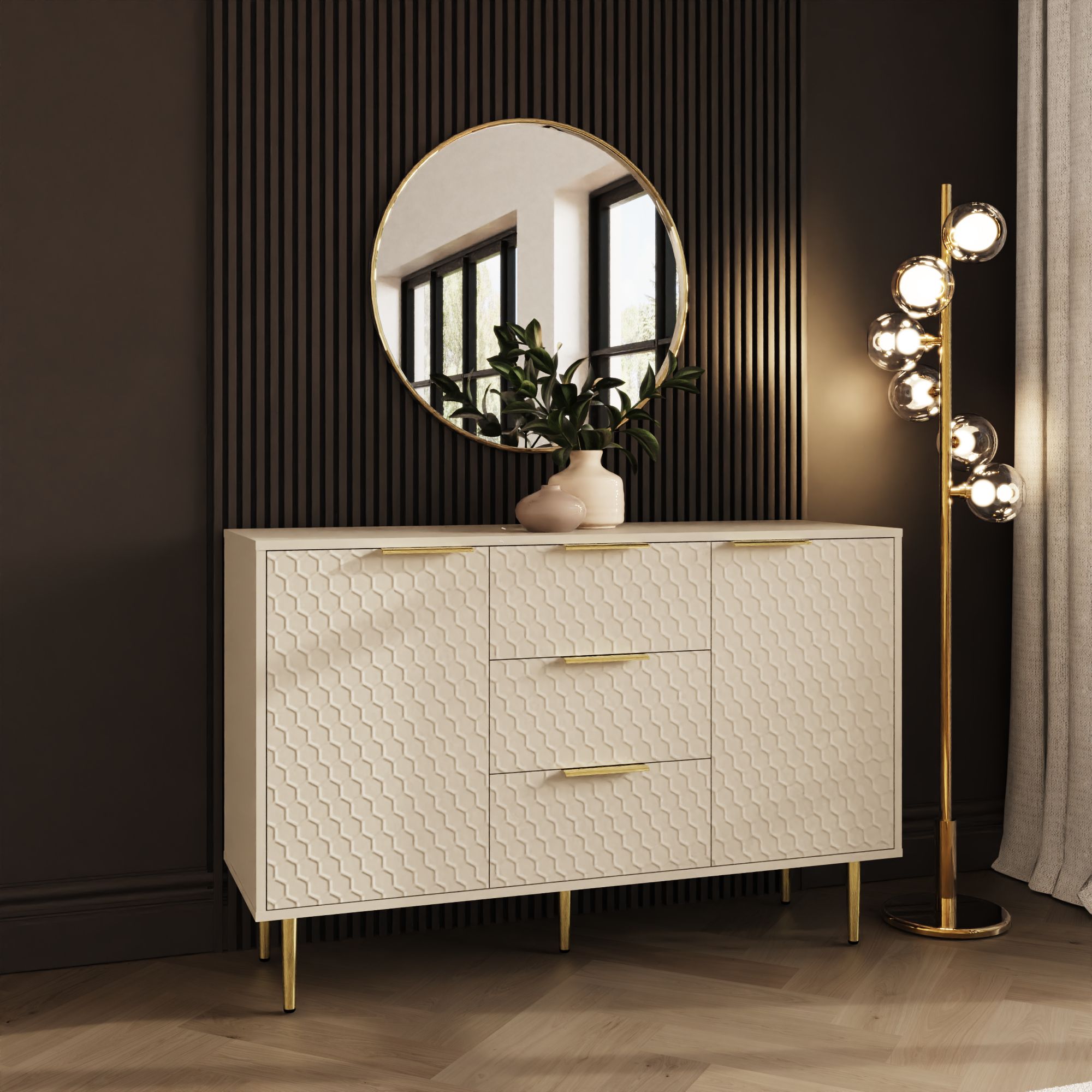 Elevate your home with the AZIEL Living Range, a collection that perfectly blends luxury and contemporary sophistication. Featuring a striking geometric honeycomb design in an elegant ivory finish with contrasting brass handles and legs. The soft tones and metallic accents bring warmth and light to your space, creating an effortlessly stylish and inviting atmosphere. From statement sideboards to sleek coffee and TV units, the AZIEL Living Range offers versatile storage solutions designed to keep your home beautifully organised.