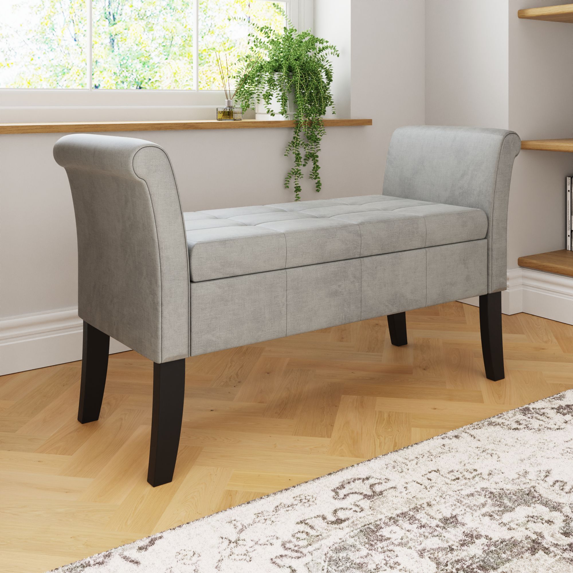 This elegant Balmoral window seat with deep buttoned seat, graceful legs and generous storage space is new and is available in both a luxurious silver or grey chenille fabric and hard wearing brown faux leather.