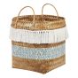 This boho basket is definitely going to turn the heads of all your houseguests. Handmade out of natural bamboo wood, the piece is highly decorative, especially thanks to a blue, abstract motif, and white cotton tassels. It is also easy to move around, due to being lightweight, and having handles. Inside, you'll be able to store extra throws or blankets for your living room. Details: Color: Natural, White, Blue. Main material: Bamboo Wood. Additional material: Cotton. Weight: 0.8 Assembly: Does Not Require Assembly