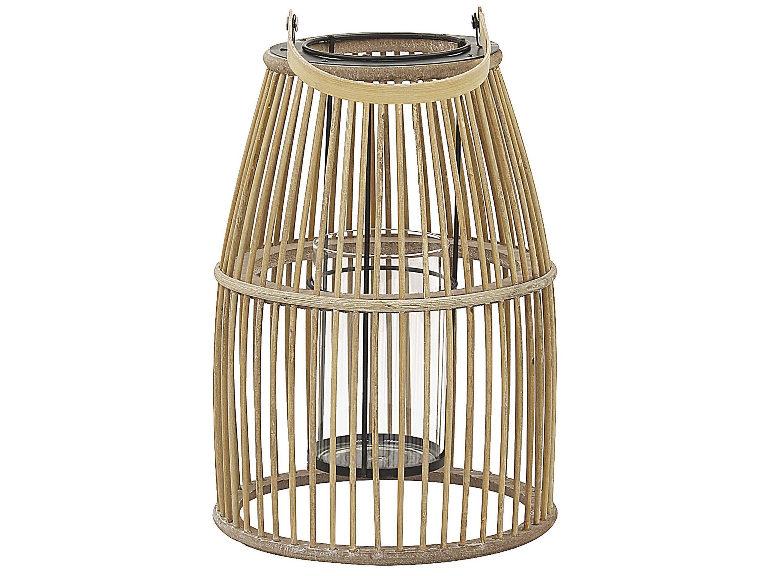 Natural material and colour for your living or garden area. This candle lantern in boho design is made of sturdy and highly aesthetic bamboo wood that warms up every furniture set. Featuring a glass candle holder and a carrying handle, this lantern is a great companion of long summer evenings. Details: Color: Beige. Main material: Bamboo Wood. Additional material: Glass. Weight: 1 Assembly: Does Not Require Assembly Wood type: Bambusoideae Wood Origin: China