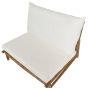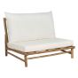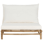 This armless bamboo armchair is a perfect relaxation spot for both indoor and outdoor settings. Boasting a low frame and a wide seat that is fitted with generously padded cushions, it ensures ultimate comfort. With the natural light tone of wood and an off-white cushions’ fabric, it suits seamlessly within any modern style, like Japandi or Scandinavian. Details: Color: Light Wood, White. Main material: Bamboo Wood. Additional material: Polyester. Material Composition: 100% Polyester Weight: 10 Assembly: Full Assembly Required Wood type: Bambusa vulgaris Wood Origin: Vietnam Weight Capacity: 100 Cushions Dimensions: 100x50x15/100x70x10 Padding Thickness: 5 Seat Height: 24