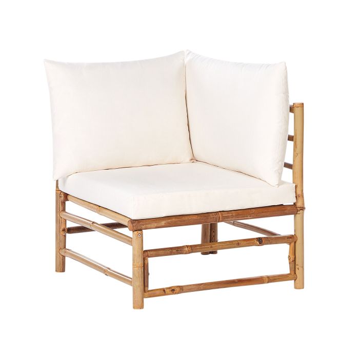 Create your perfect outdoor oasis with this bamboo corner section for garden modular sets. Embrace boho vibes with this versatile piece featuring comfy seat cushions with removable covers. Rearrange effortlessly to suit your space. Ideal for gardens and patios, this modular design invites relaxation and style. Upgrade your outdoor living with natural elegance. Details: Color: White, Light Wood. Main material: Bamboo Wood. Additional material: Polyester. Material Composition: 100% Polyester Weight: 10 Assembly: Full Assembly Required Wood type: Bambusa vulgaris Wood Origin: Vietnam Weight Capacity: 100 Cushions Dimensions: 41x53 Padding Thickness: 8 Seat Height: 39