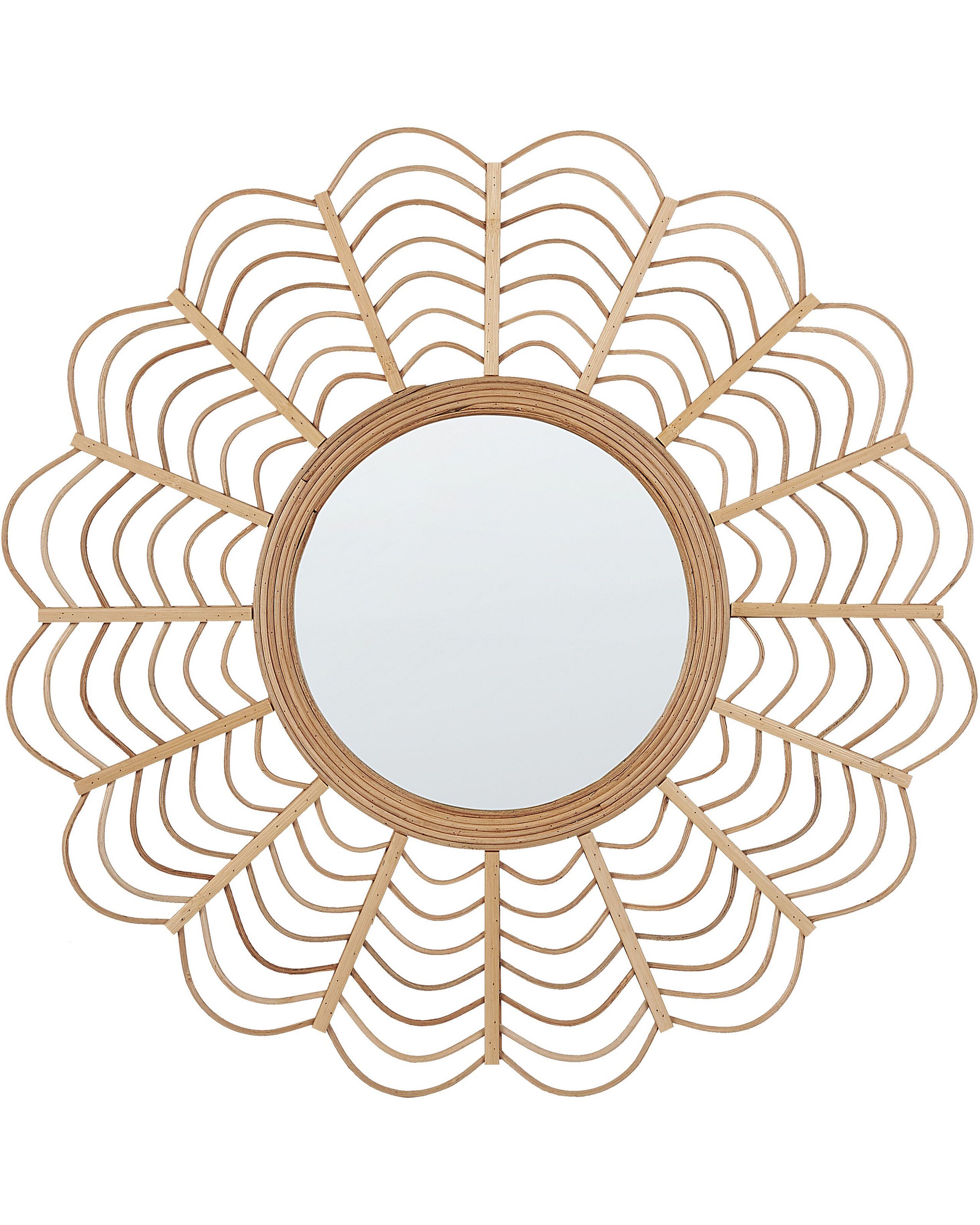 Introduce a touch of style to your home with this sun-shape inspired wall mirror. It makes a statement piece in a dining room, or living area, but at the same time can harmonize with already present décor. Bamboo frame perfectly complements sunburst construction made of rattan, creating a balanced decoration that will match ideally with home plants, ceramic vases, or wooden accessories. Details: Color: Natural, Beige. Main material: Bamboo Wood. Additional material: Rattan. Weight: 1 Assembly: Does Not Require Assembly