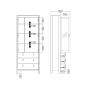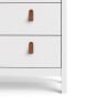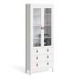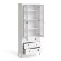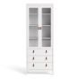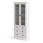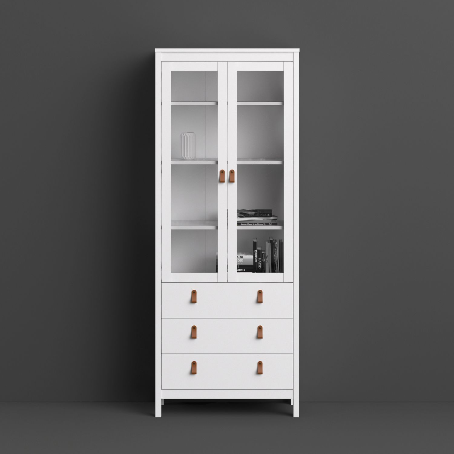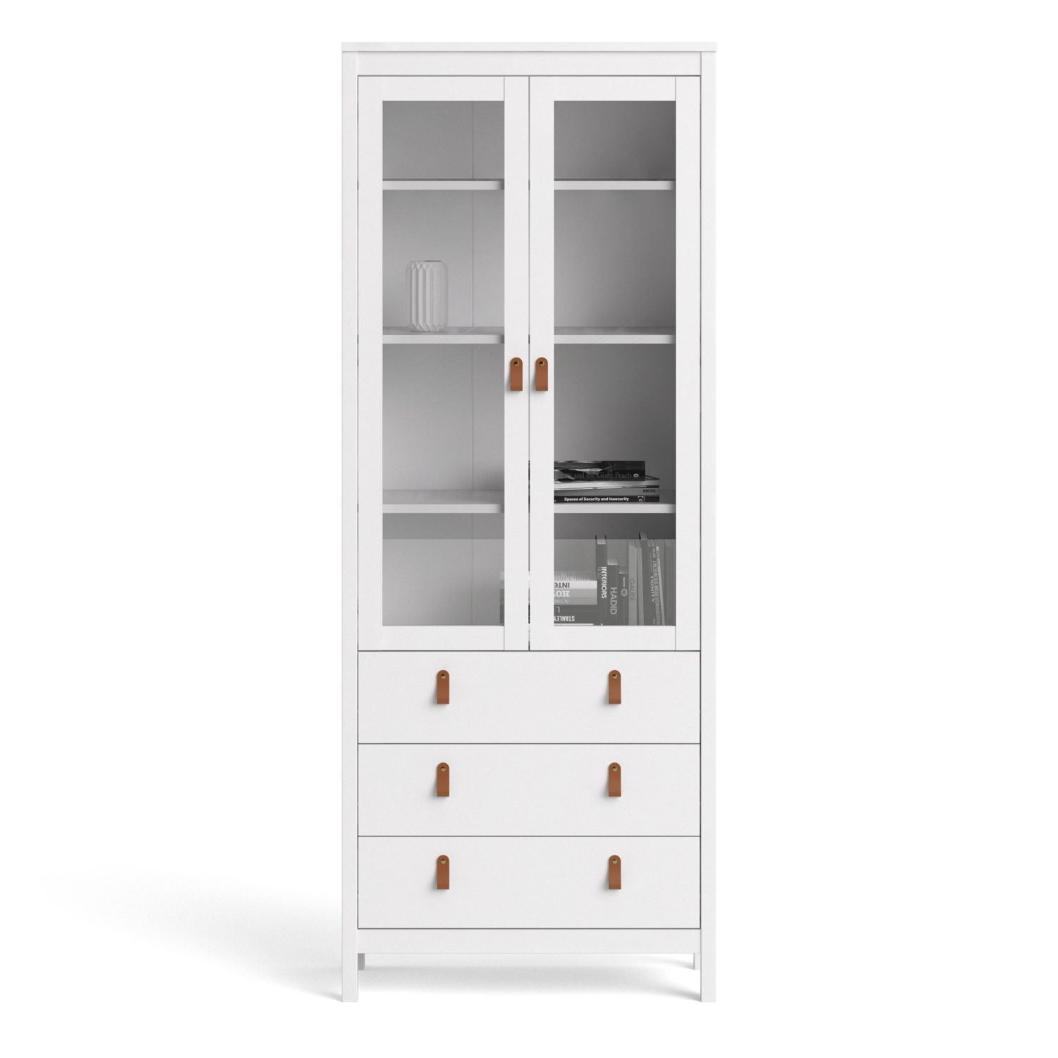 A modern glass display cabinet with two doors and three drawers in a striking design complete with brown leather tab handles, also available in contrasting matt black