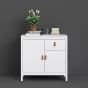 A modern sideboard inclduing plenty of storage in a striking design complete with brown leather tab handles, also available in contrasting matt black