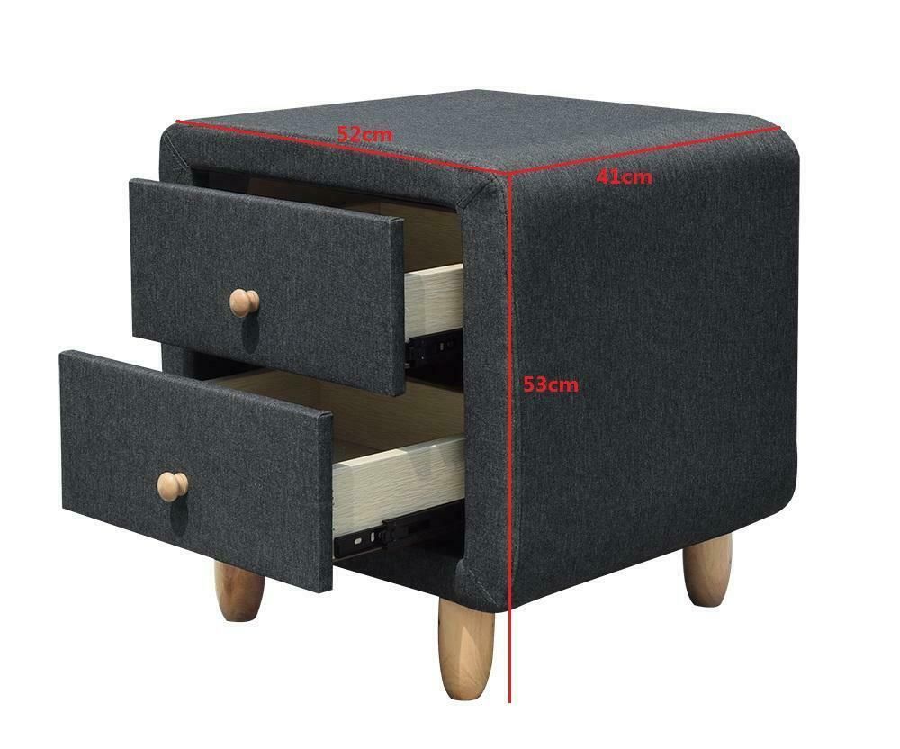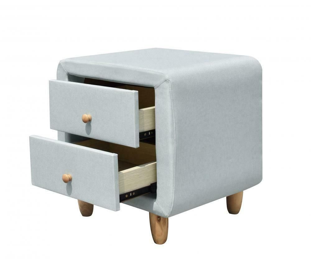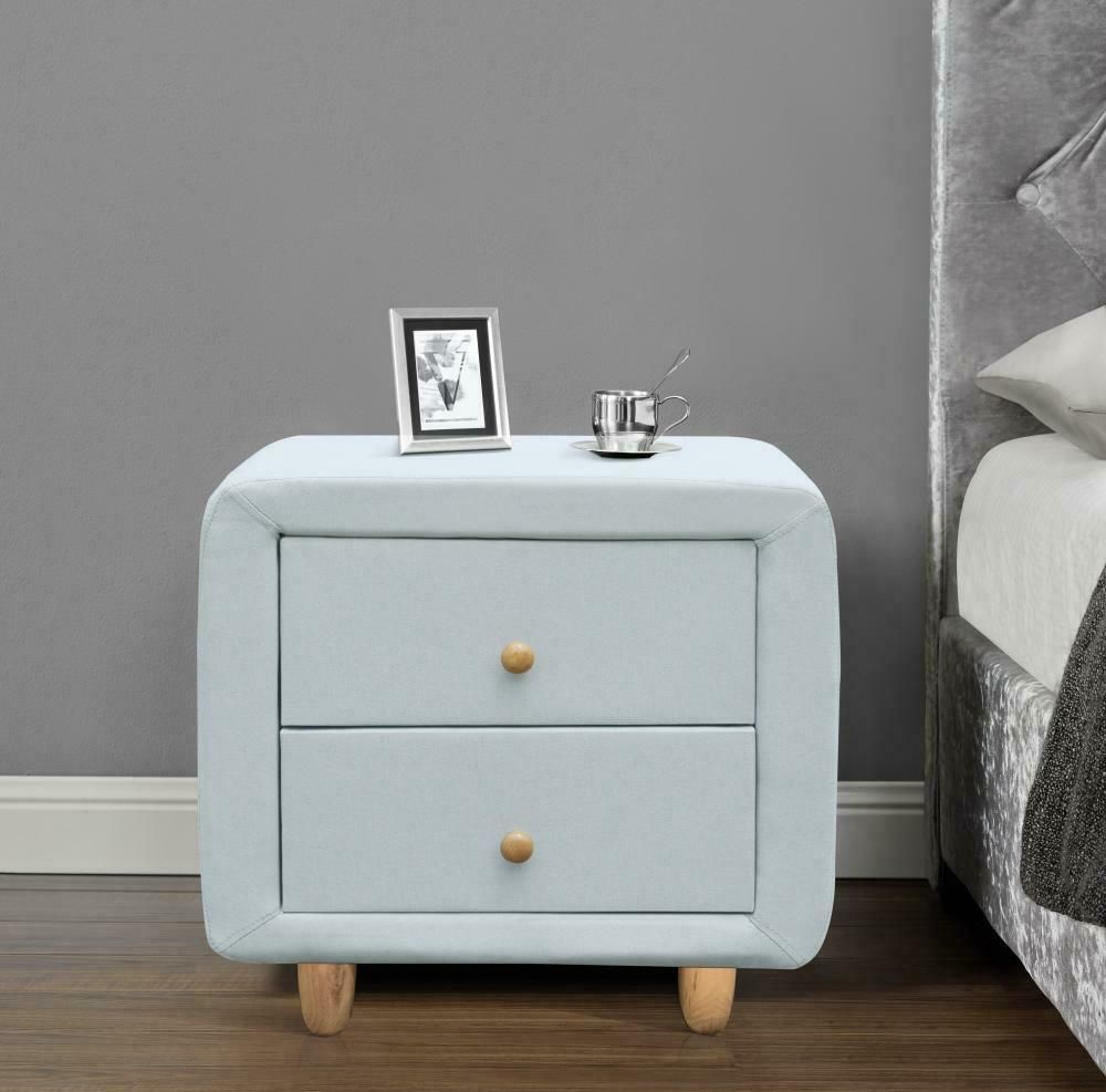 This stylish modern and contemporary designed Fabric 2 Drawer Bedside Table is finished in linen fabric in the choice of Grey or Duck Egg Blue. It features an elegant neat drawers to store your bedtime essentials with stunning oak wood feet and handles, it can be used to place your table lamp, photos or ornament on its spacious surface top. This 2 Drawer cabinet unit is an essential piece of bedroom furniture and the perfect choice to add the finishing touches to your modern bedroom. Available to buy as either a pair or individually. Please select from the drop down menu.